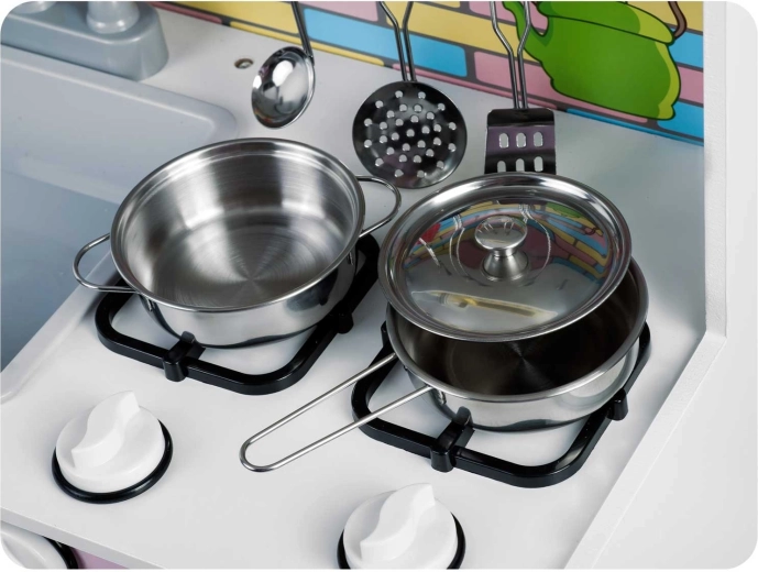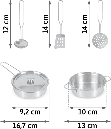 A csomag tartalma: kis fazék fülekkel, lábas fedővel és hosszú nyéllel, merőkanál, lyukacsos lapát/fordítólapát és lyukacsos kanál/szűrőkanál. A fém kiegészítők tartósak, könnyen karbantarthatók, és tökéletesen illenek a gyerekkonyhákhoz, beleértve a RICOKIDS márka modelljeit is.