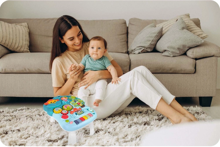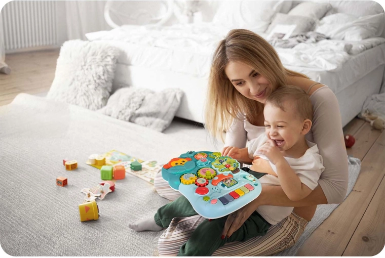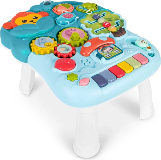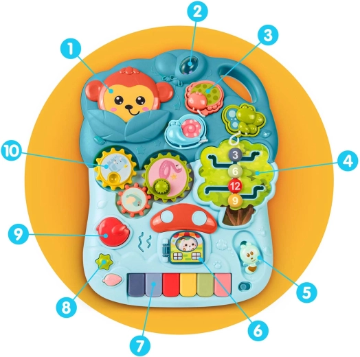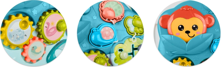 Gombok, fogaskerekek, csúszkák, labirintus és színes billentyűk segítik a színek, formák és számok tanulását, valamint fejlesztik a finommotorikát és az érzékelést.