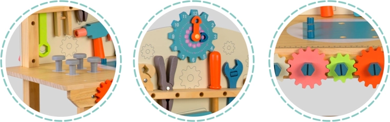 Az elülső panel színes fogaskerekeivel és a sok csavarral, anyával fejleszti a finommotorikát és a koordinációt. A gyerekek a kerekek összekapcsolásával a logikát gyakorolják, a meghúzás közben pedig az ujjak fogását edzik.