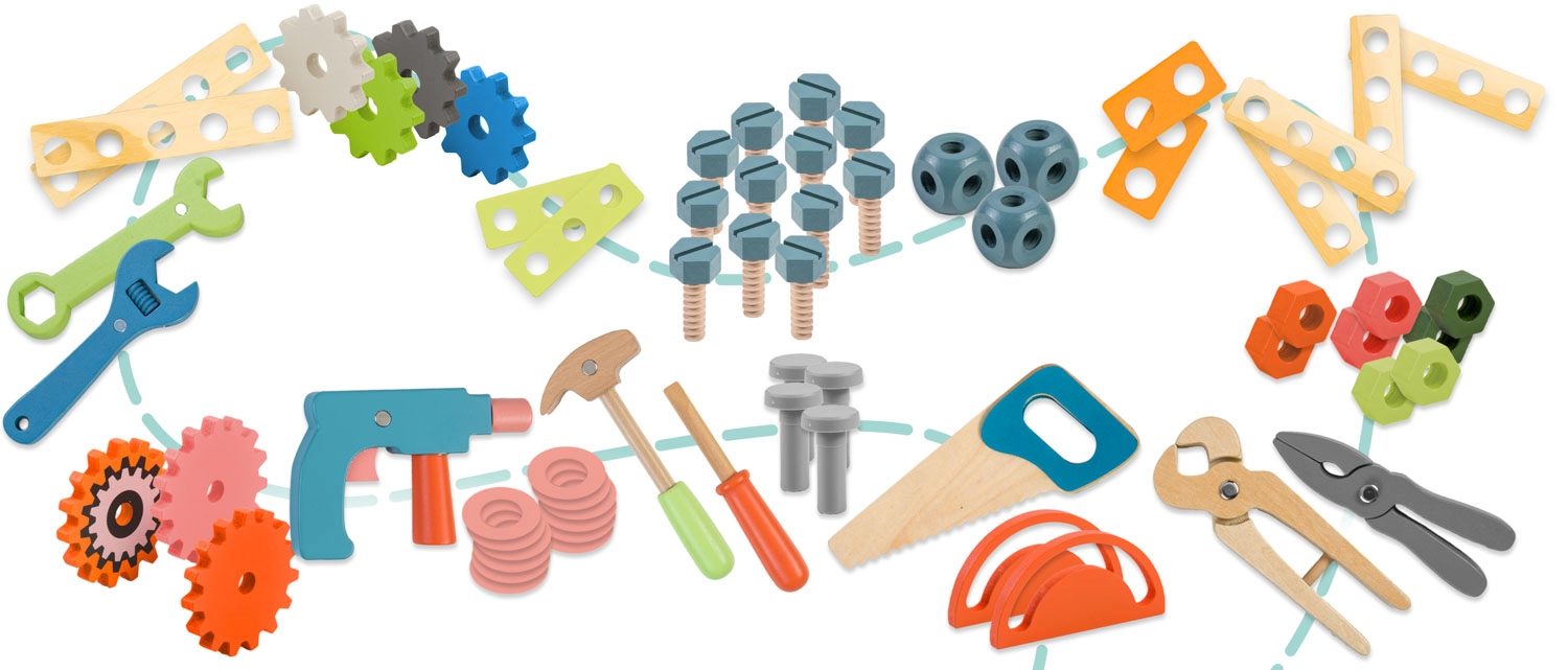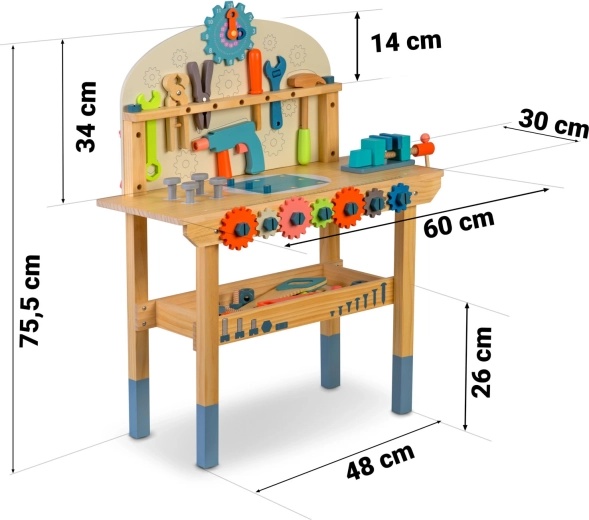 Ez a fa munkapad széles szerszámkészletével saját mini műhelyt ad a gyerekeknek. A forgó fogaskerekeknek, a működő satunak és a sok csavarnak és anyának köszönhetően a kis barkácsolók megtanulnak meghúzni, csavarozni és egyszerű szerkezeteket összeállítani. Az átgondolt tárolómegoldások és az akasztós tábla minden elemet kéznél tart.