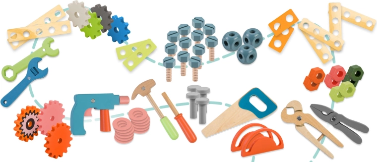 - Valósághű játék: kalapács, csavarhúzó, kulcsok, fűrész, fogó, fúró és további kiegészítők.