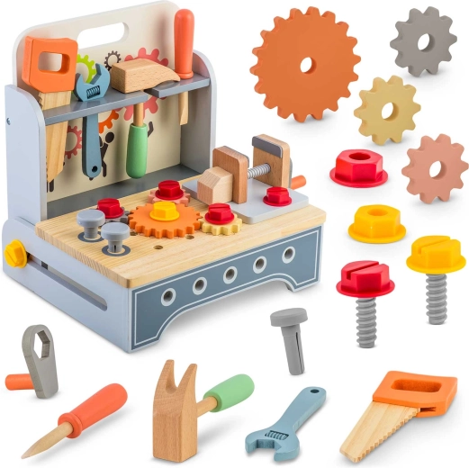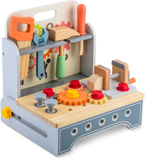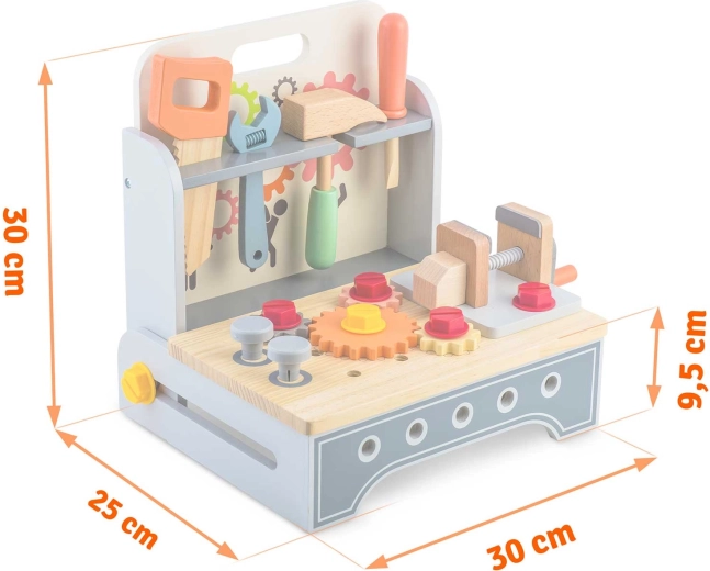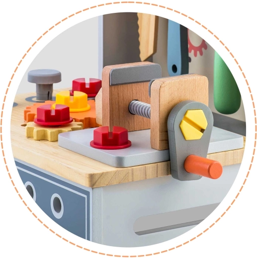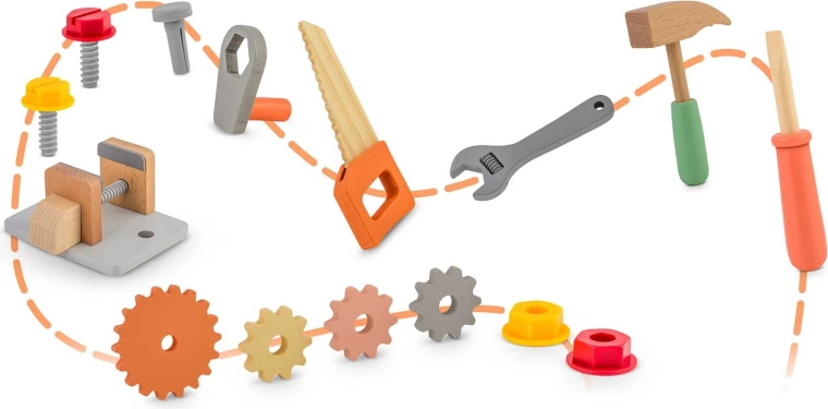 Kalapács, csavarhúzó, villáskulcs és fűrész saját helyet kap a panelen és a polcon. Biztonságos és tartós kivitel, kifejezetten kis kezekhez.