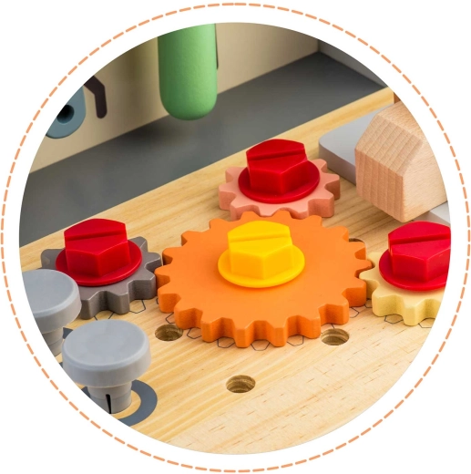 Az összekapcsolt, színes áttétek együtt mozognak forgatáskor, fejlesztve a finommotorikát, a logikát és a gyerekek kíváncsiságát.