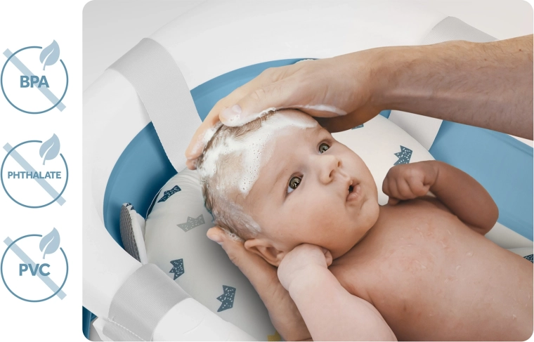Ergonomikus, légáteresztő és gyorsan száradó betét, amely finoman megtámasztja a baba fejét és hátát. Három állítható pánt gondoskodik a stabil, csúszásmentes rögzítésről.