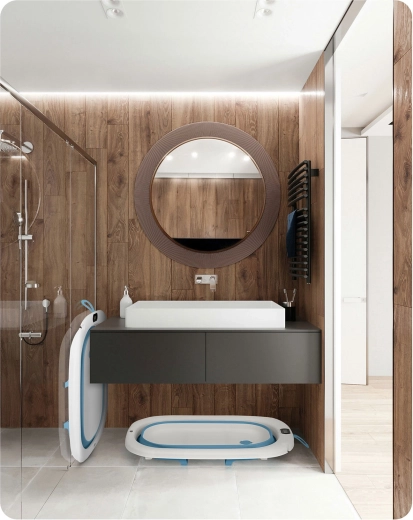 A stabil, kihajtható lábaknak és a csúszásgátló végeknek köszönhetően a kád még csúszós felületen is masszívan áll. Az összecsukható kialakítás helytakarékos, könnyen hordozható és tárolható – ideális kisebb fürdőszobákba és nyaraláshoz is. A praktikus zuhanyrózsa-tartó kényelmes vízengedést tesz lehetővé felesleges fröcskölés nélkül.