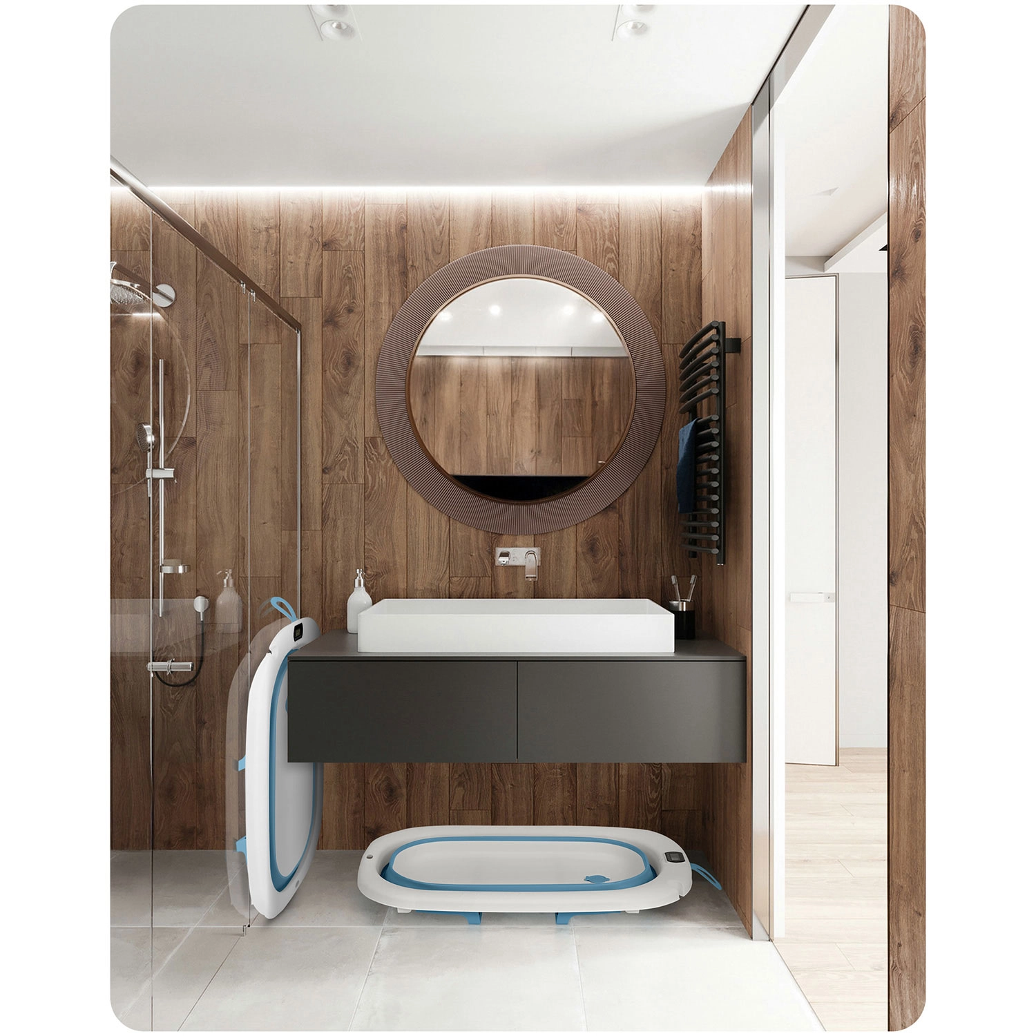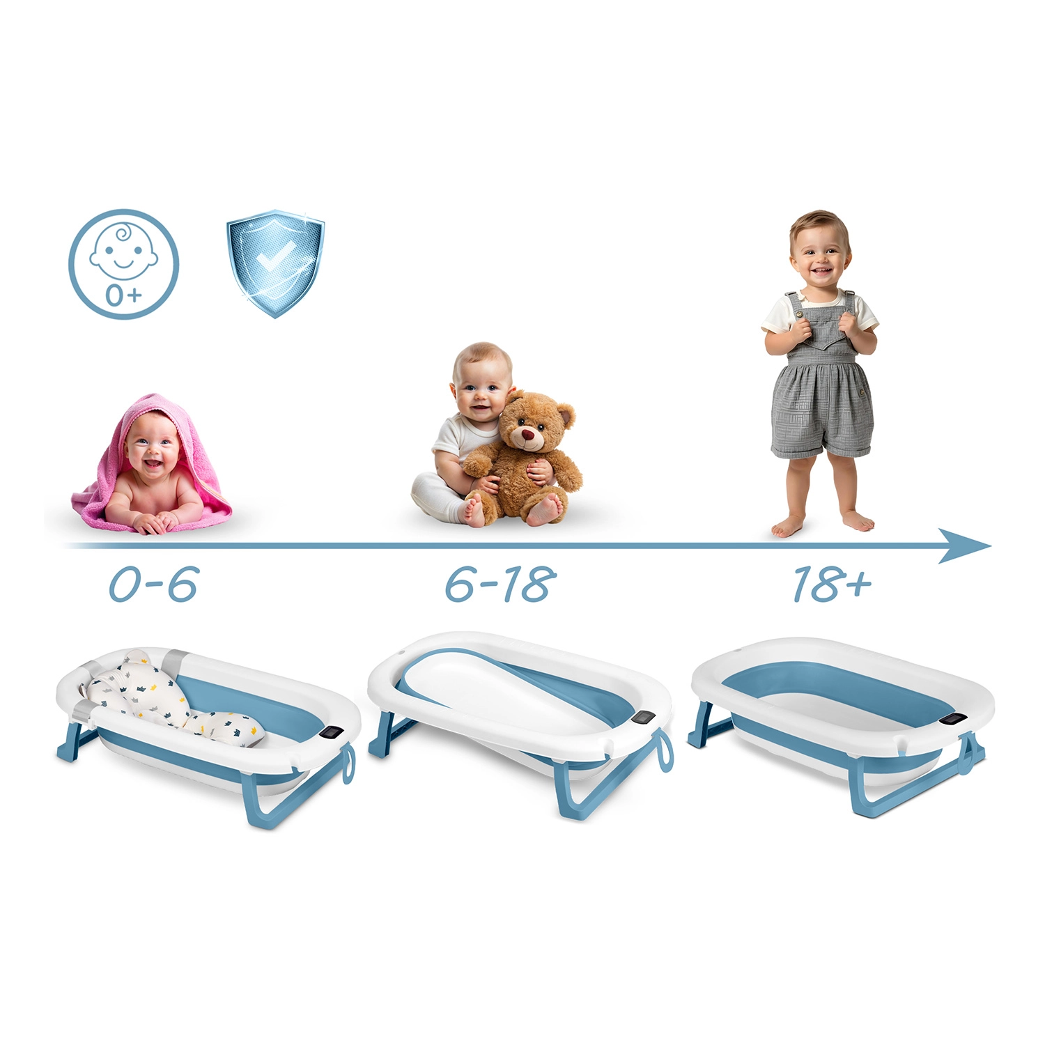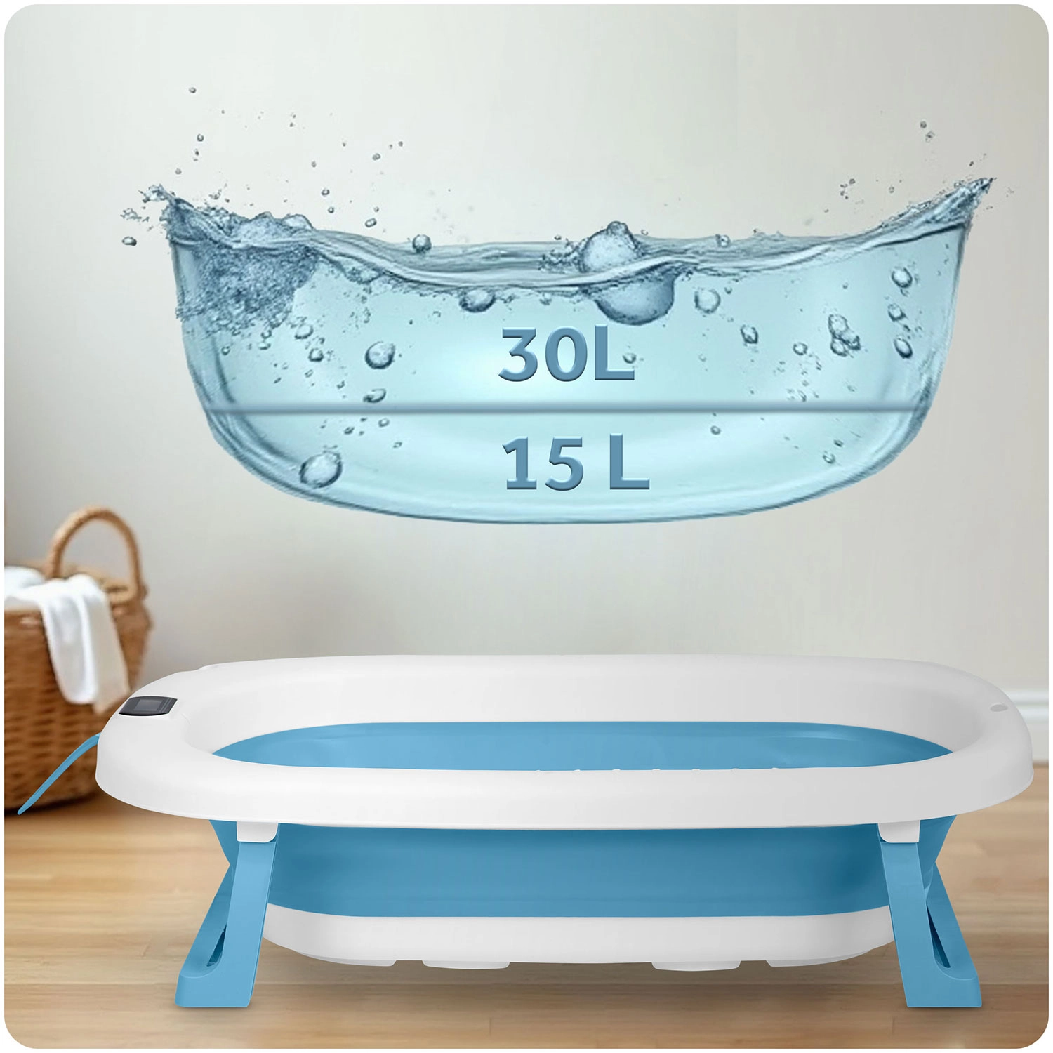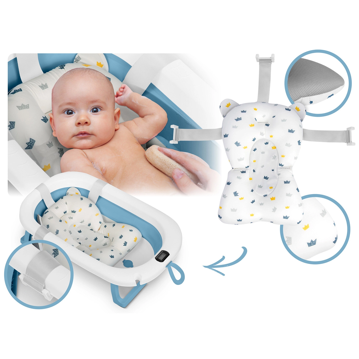 Ez az összecsukható babakád a legelső napoktól biztonságos és kényelmes fürdetést kínál. A pontos szondával és LCD kijelzővel ellátott elektronikus hőmérő segít az ideális vízhőmérséklet ellenőrzésében, míg a dugó színt vált, amikor a hőmérséklet meghaladja a 38 °C-ot. A csomag része egy puha, légáteresztő és gyorsan száradó betét állítható pántokkal, amely finoman megtámasztja a baba fejét és hátát.
