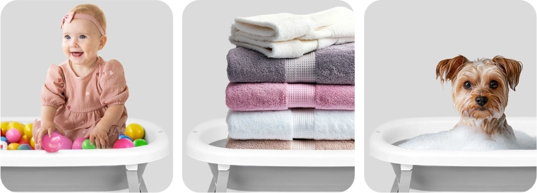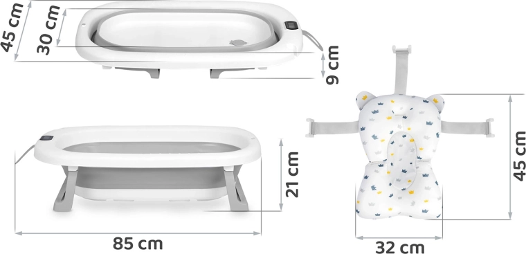 Az összecsukható kialakítás kihajtható, stabil lábakkal és csúszásgátló talpakkal a csúszós padlón is magabiztosságot ad. Kompakt méreteinek köszönhetően összehajtva könnyen tárolható vagy magával vihető utazáshoz. A praktikus zuhanyrózsa-tartó fröcskölés nélkül segíti a feltöltést, az alján lévő leeresztő pedig felgyorsítja az ürítést.