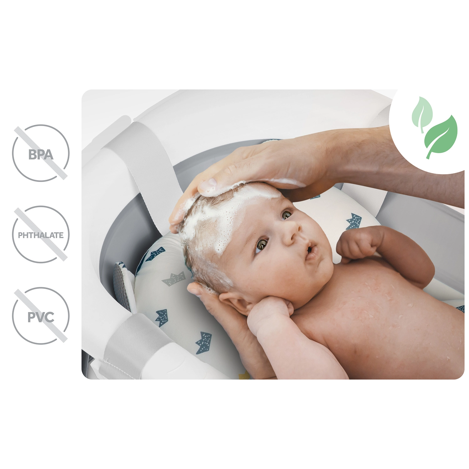 A párnázott, gyorsan száradó betét állítható pántokkal biztonságosan rögzül a kád pereméhez. Megtámasztja a fejet és a hátat, növelve a kényelmet és a biztonságot.
