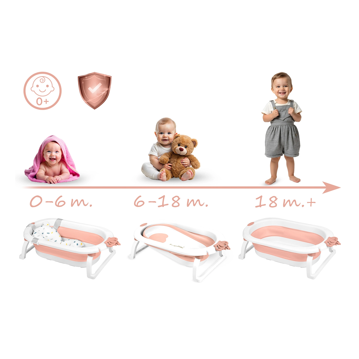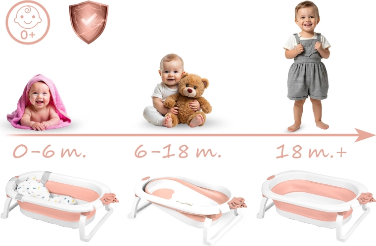 Élvezze a nyugodt és kényelmes fürdetést egy káddal, amely együtt nő gyermekével. Az újszülötteknek ergonomikus fejtámaszt és hátalátámasztást nyújt a puha betét állítható pántjaival, a nagyobbaknak pedig biztonságos, tágas teret ad a játékos pancsoláshoz. Az összecsukható szerkezet kevés helyet foglal a kis fürdőszobában és utazáskor is, a leeresztő dugó hőmérsékletjelzővel pedig gondoskodik róla, hogy a víz mindig kellemesen meleg legyen.