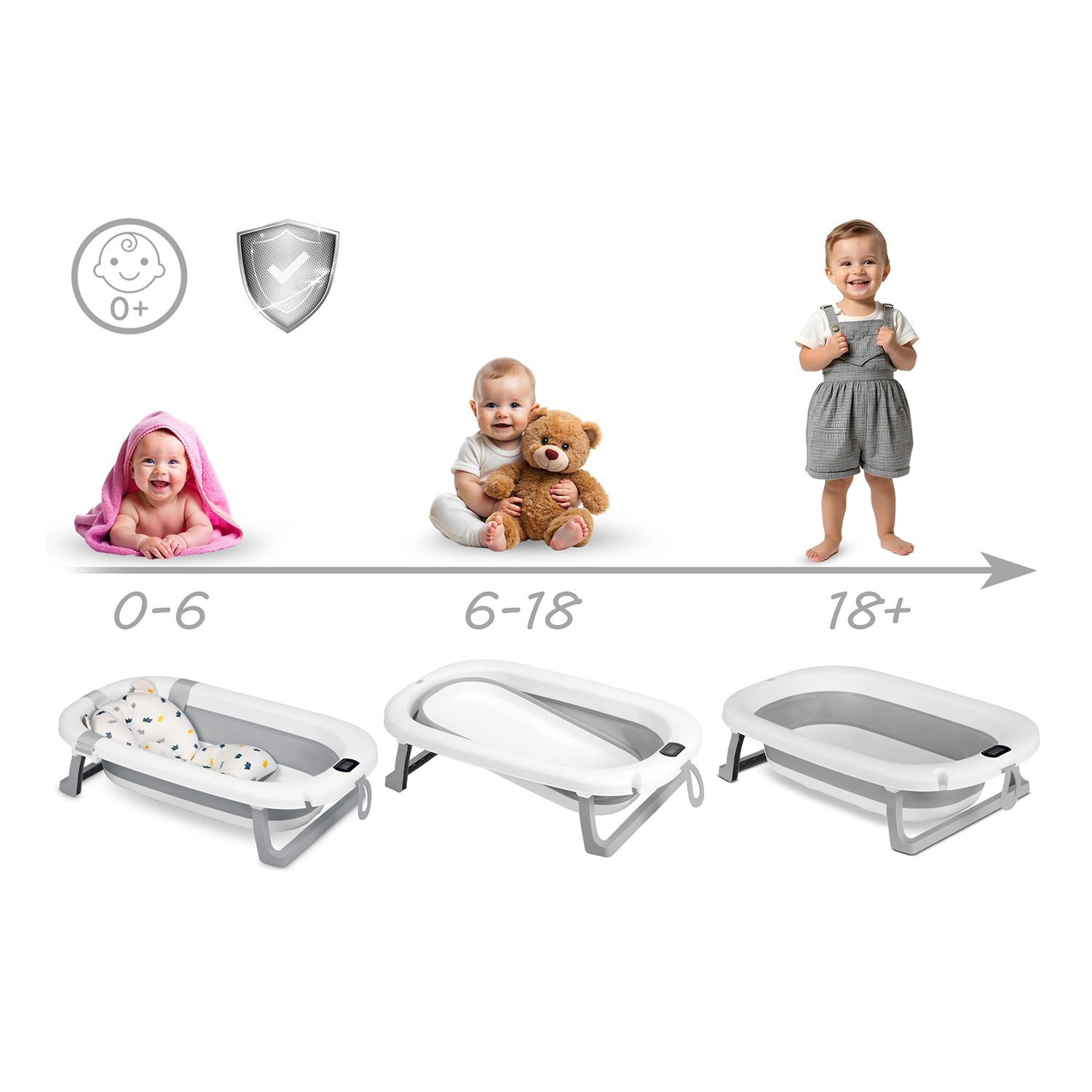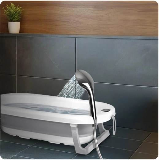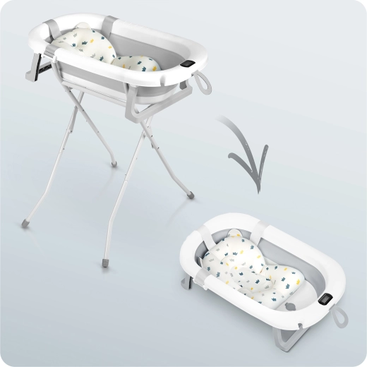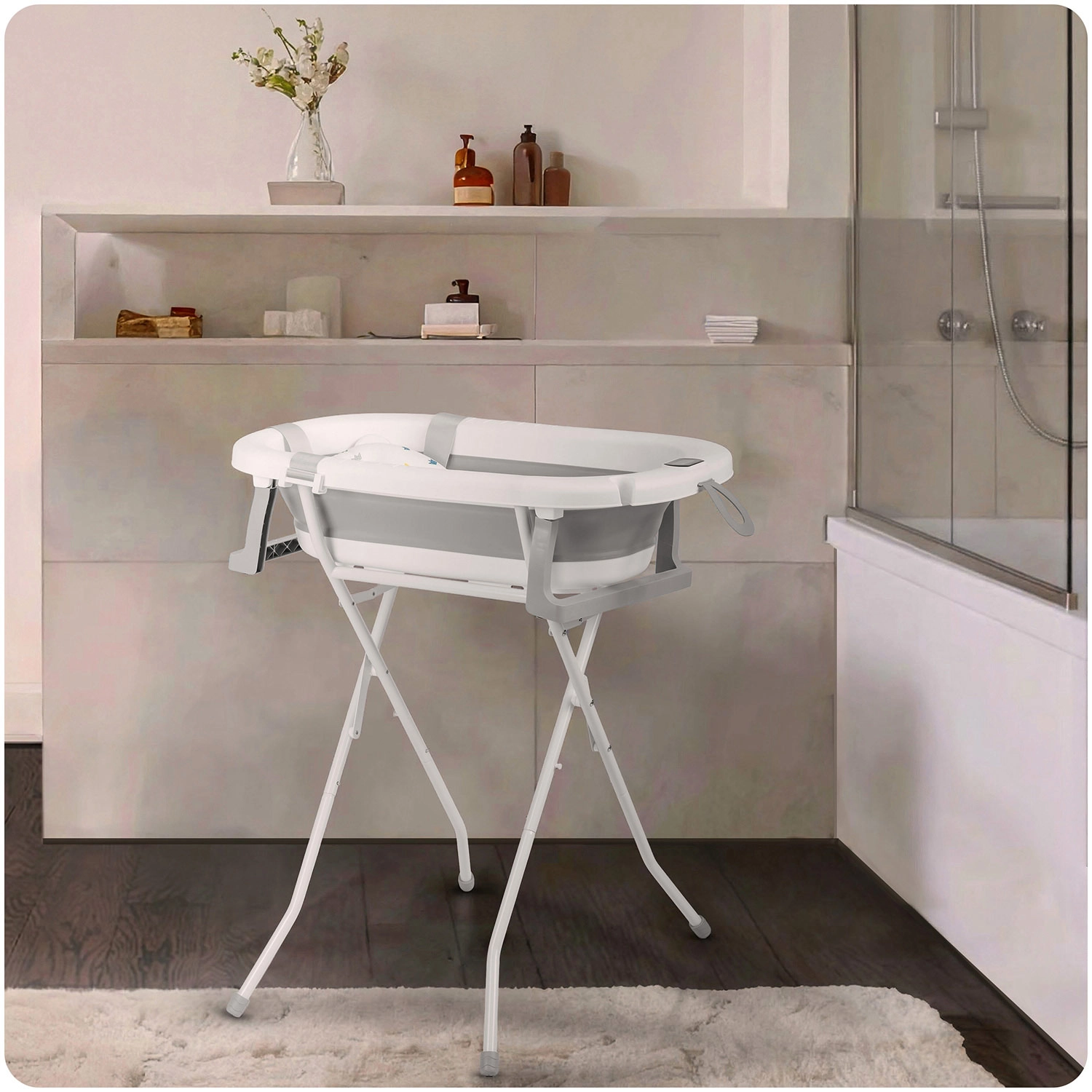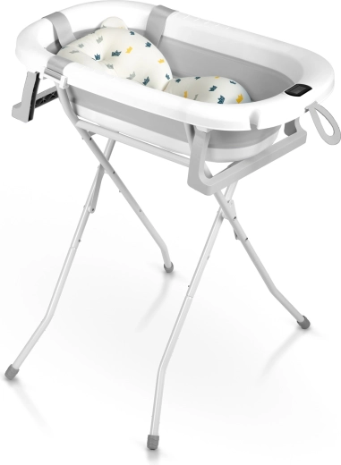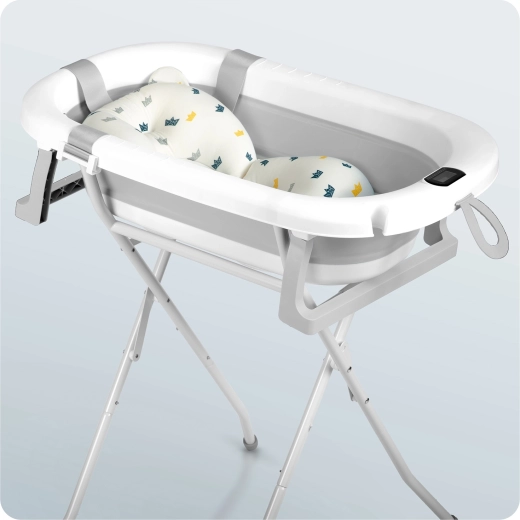 A kádat masszív, összecsukható állványra helyezheti, csúszásgátló lábakkal és keresztirányú merevítéssel. A fürdetés ergonomikus magasságban történik, hátmegerőltetés nélkül, az állvány pedig helytakarékos formára hajtható az egyszerű tároláshoz.
