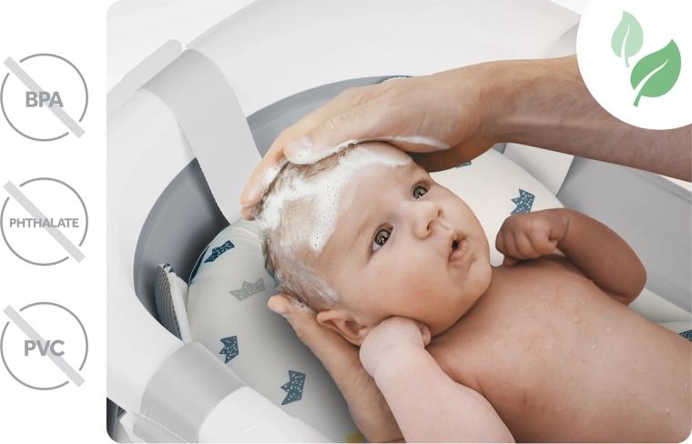A összecsukható kialakításnak és az opcionális magas lábaknak köszönhetően a kádat könnyű áthelyezni, tárolni és magával vinni. A csúszásgátló lábak és a masszív lábzárak gondoskodnak a stabilitásról. A praktikus zuhanyfej-tartó lehetővé teszi a kád fröccsenésmentes feltöltését, és mindkét keze szabadon marad mosdatás közben. A BPA-mentes anyagok megfelelnek a szigorú európai biztonsági előírásoknak.