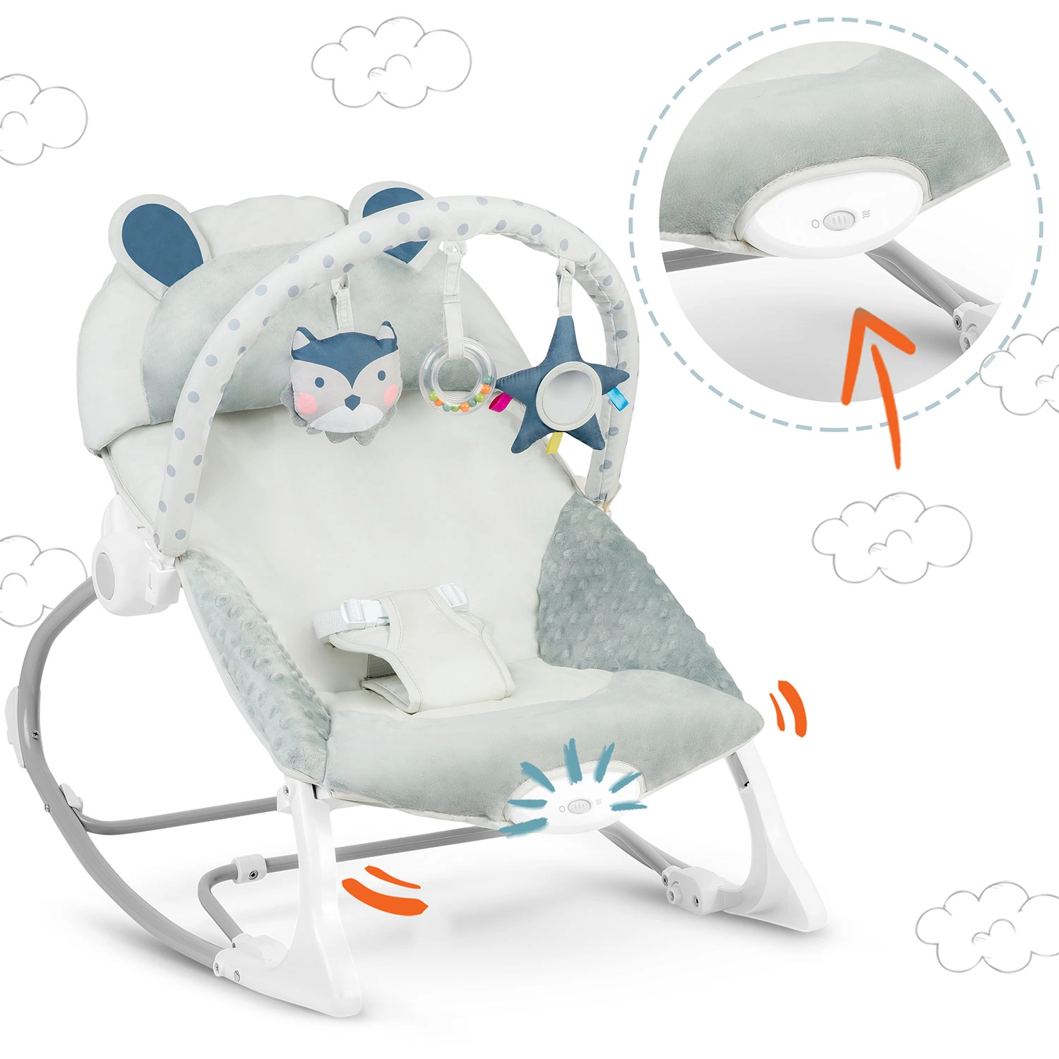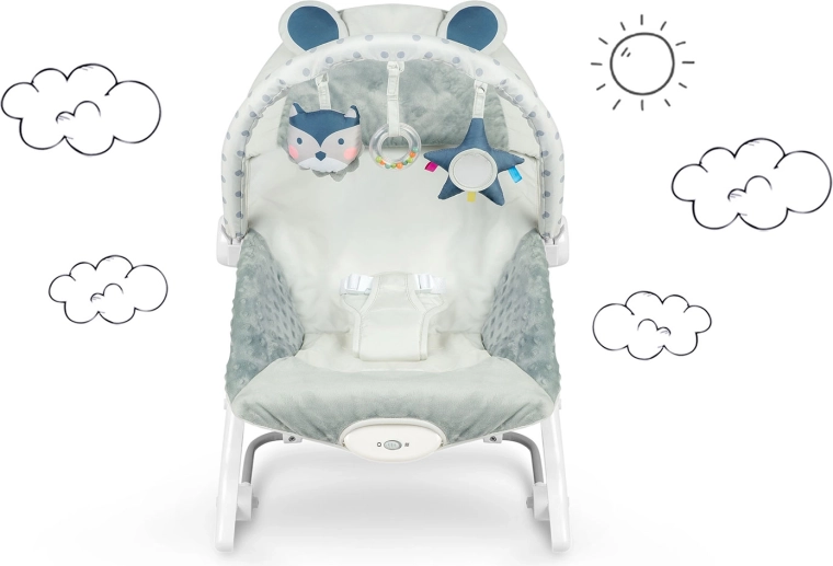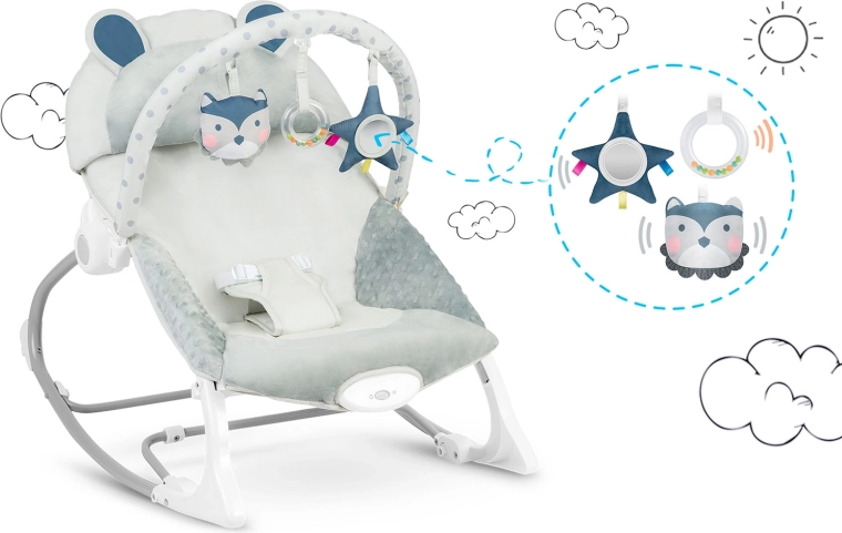A ringatás nyugtató ritmusa és az opcionális rezgő funkció segít a babának ellazulni és gyorsabban elaludni, miközben Önnek szabad marad a keze az apró teendőkhöz. A levehető játékív zörgő plüssjátékokkal és karikával serkenti a látást és a tapintást, és könnyen személyre szabható – a játékok áthelyezhetők vagy kedvencekre cserélhetők.