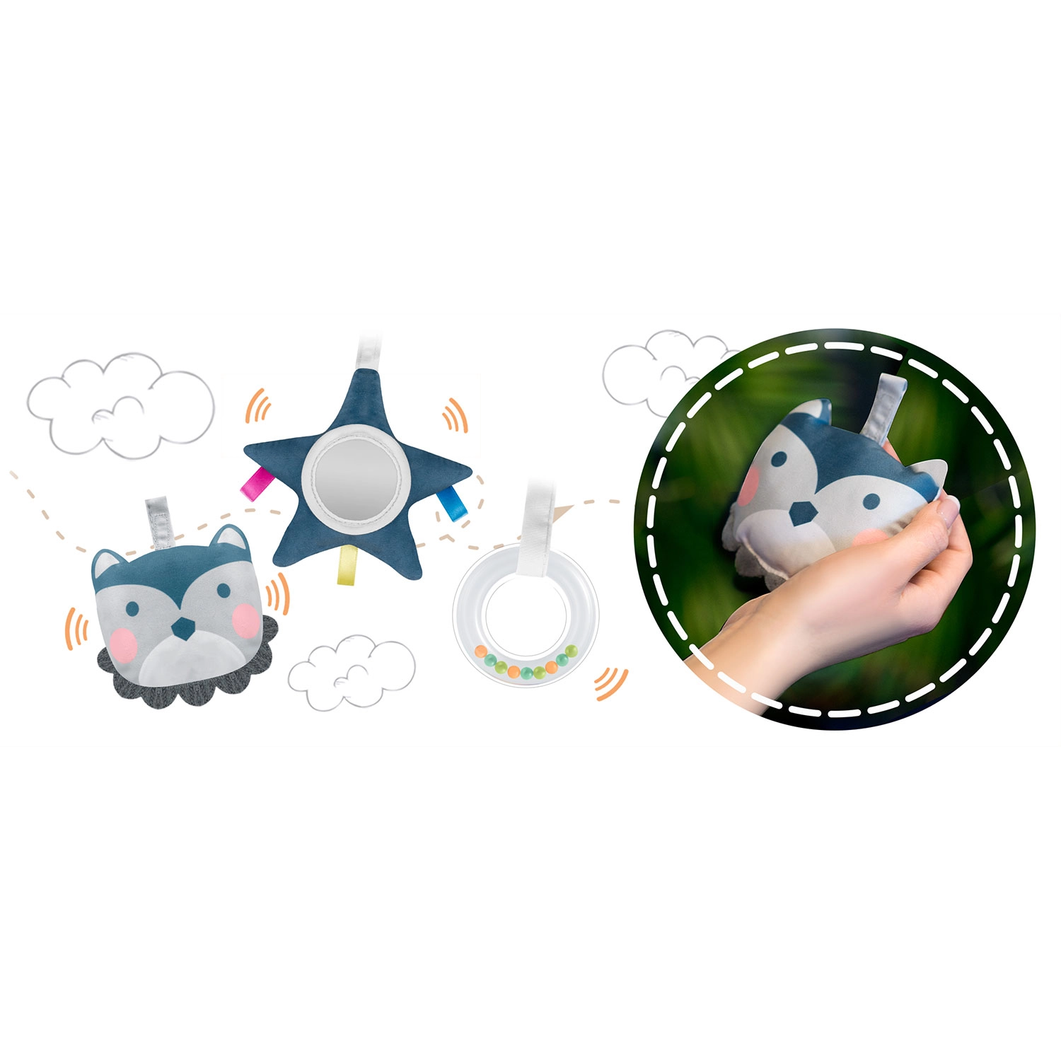 A levehető játékív zörgő játékokkal, karikával és biztonságos tükröcskével támogatja a látást, a tapintást és a koordinációt. A játékok könnyen átrendezhetők vagy cserélhetők.