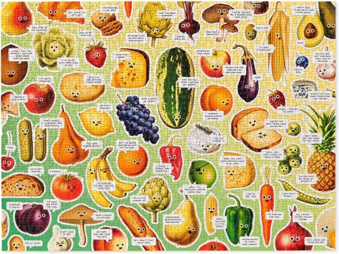 Vidám ételek színes kollázsa „googly” szemekkel, amely szórakoztató részleteket és kellemes kihívást kínál kezdőknek és gyakorlott kirakózóknak egyaránt.
