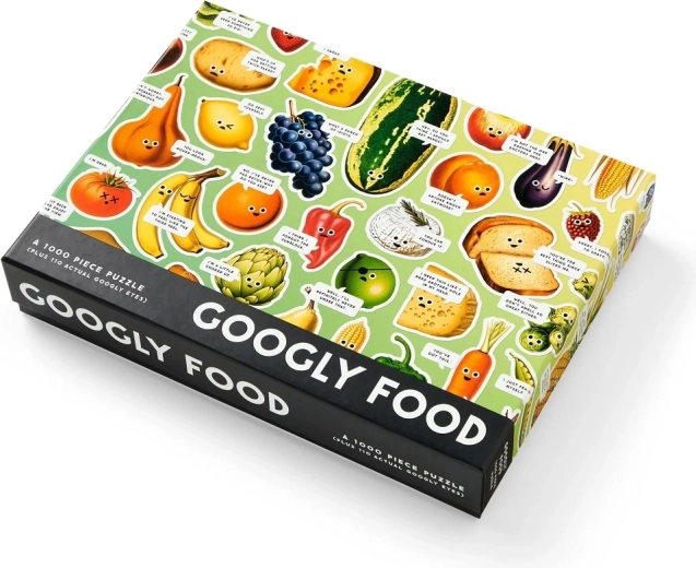 Fedezze fel az ételek játékos világát a Googly Food 1000 darabos kirakóval, ahol a színes gyümölcsök és zöldségek mókás szemekkel kelnek életre humorral és részletekkel. Várják Önt a fényes elemek (spot UV), amelyek kiemelik az illusztrációt, valamint 110 öntapadós „googly” szem, hogy a kész kép még szórakoztatóbb legyen. A minőségi elemek FSC tanúsított és újrahasznosított anyagokból pontosan illeszkednek, és nem mérgező festékekkel készültek.