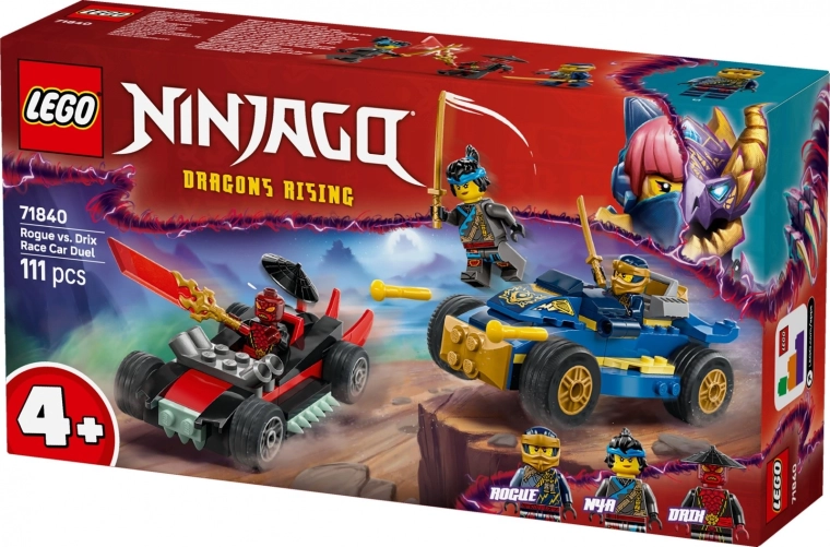 Fedezd fel a LEGO NINJAGO akciódús készletét 4 éves kortól – Rogue vs. Drix verseny két autóval, három minifigurával és egyszerű kezdőelemmel a gyors építéshez. Kilövők, arany katanák és rengeteg izgalmas jó–rossz összecsapás vár rád.