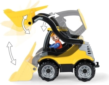 Az első kanál könnyen emelhető és billenthető, így a gyerekek homokot vagy kockákat lapátolhatnak és átszórhatnak, mint egy igazi rakodógép.