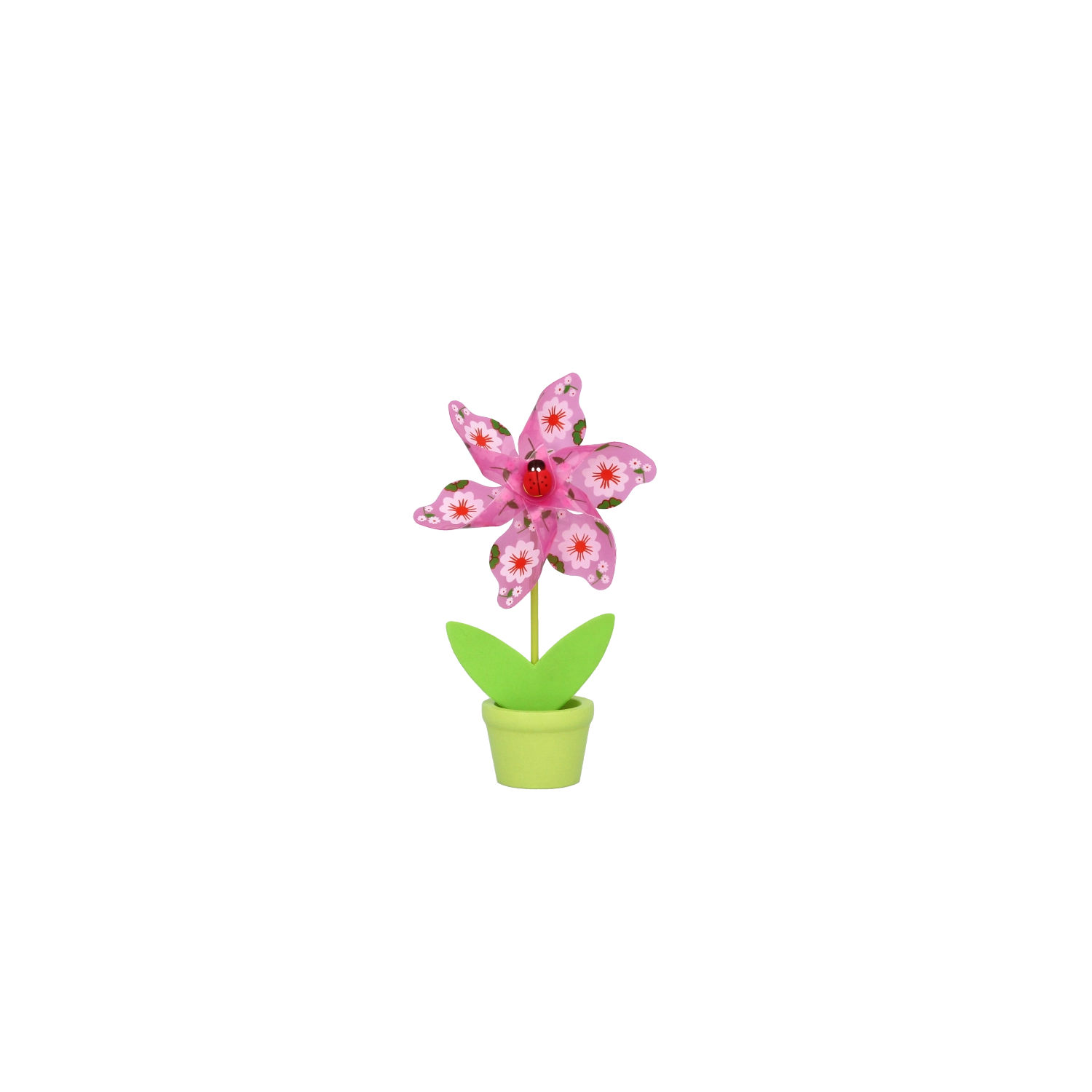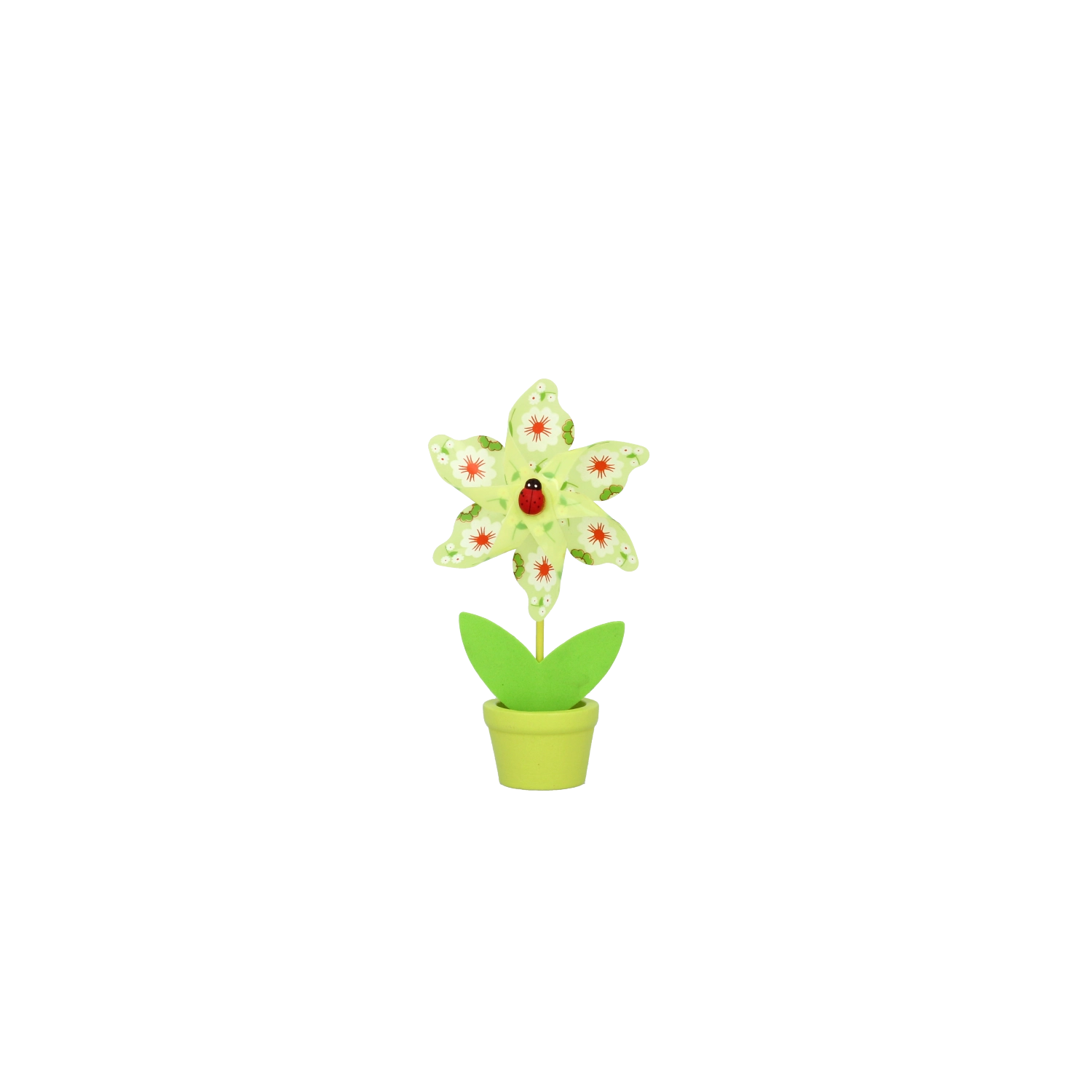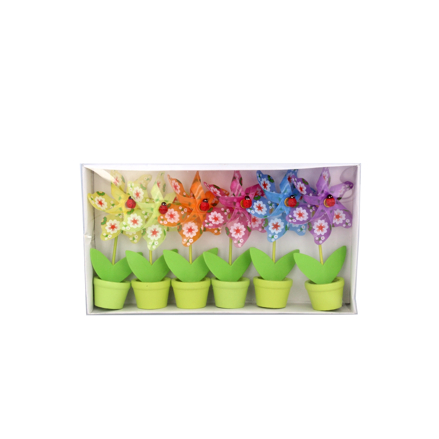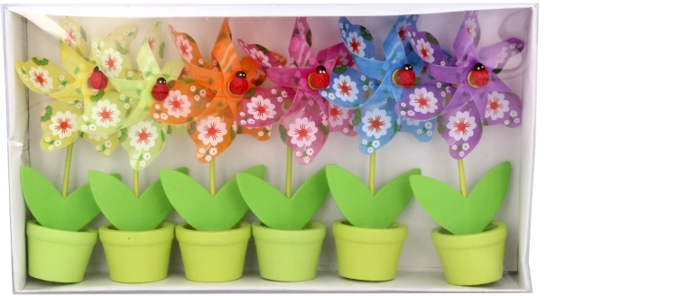 Minden szélforgó játékos virágmotívummal és apró katicabogárral készül, hat élénk színváltozatban, amelyek feldobják bármelyik helyiséget.