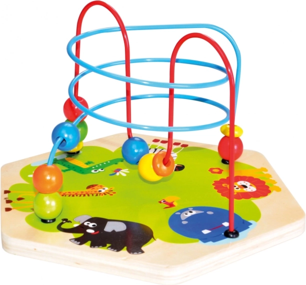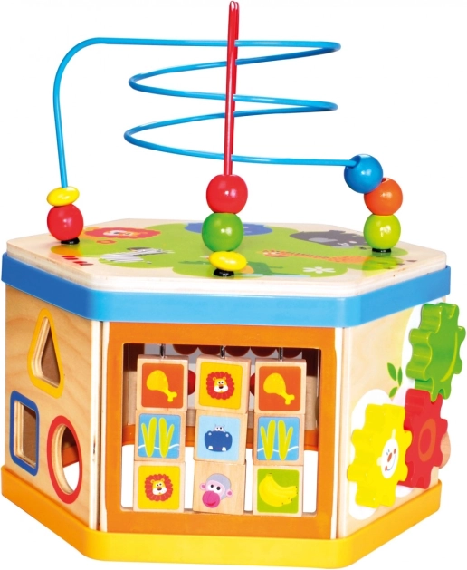 A sokoldalú motorikus játék a kíváncsi gyerekeket élénk színekkel és számos, didaktikai elemmel kiegészített tevékenységgel köti le. Lehet gyöngyöket vezetni a labirintusban, golyókat számolni, állatkákat ábrázoló ikonokat tologatni és forgatni, az állatokhoz élelmet párosítani, fogaskerekeket forgatni, formákat bedobni, valamint az idő felismerését gyakorolni. A játék masszív, erős rétegelt lemezből készült. Főbb jellemzők: fedéllel ellátott kocka és 3 betét darabbal, tér- és időorientáció fejlesztése, formák és színek párosítása, finommotorika gyakorlása, robusztus fa kivitel.