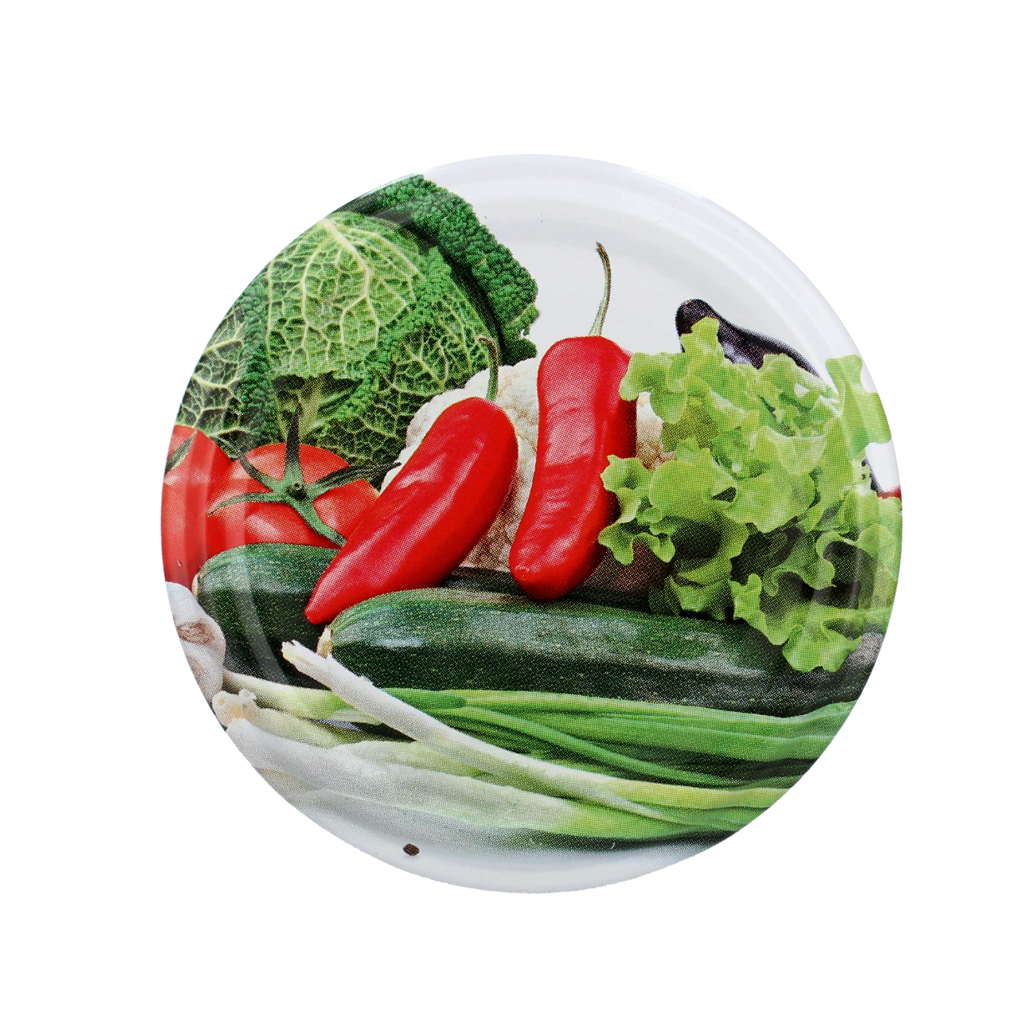 A zöldségmotívum nemcsak díszít, hanem felgyorsítja a tartalom azonosítását a kamrában. A kupakok többszöri használatra készültek, ami csökkenti a hulladékot és támogatja a fenntarthatóbb megközelítést az otthoni befőzésben.
