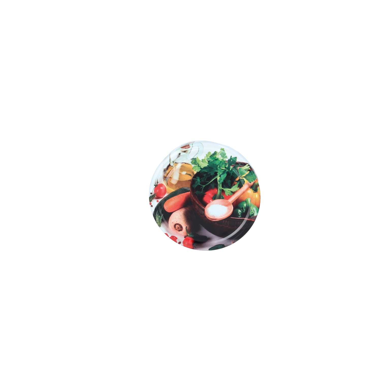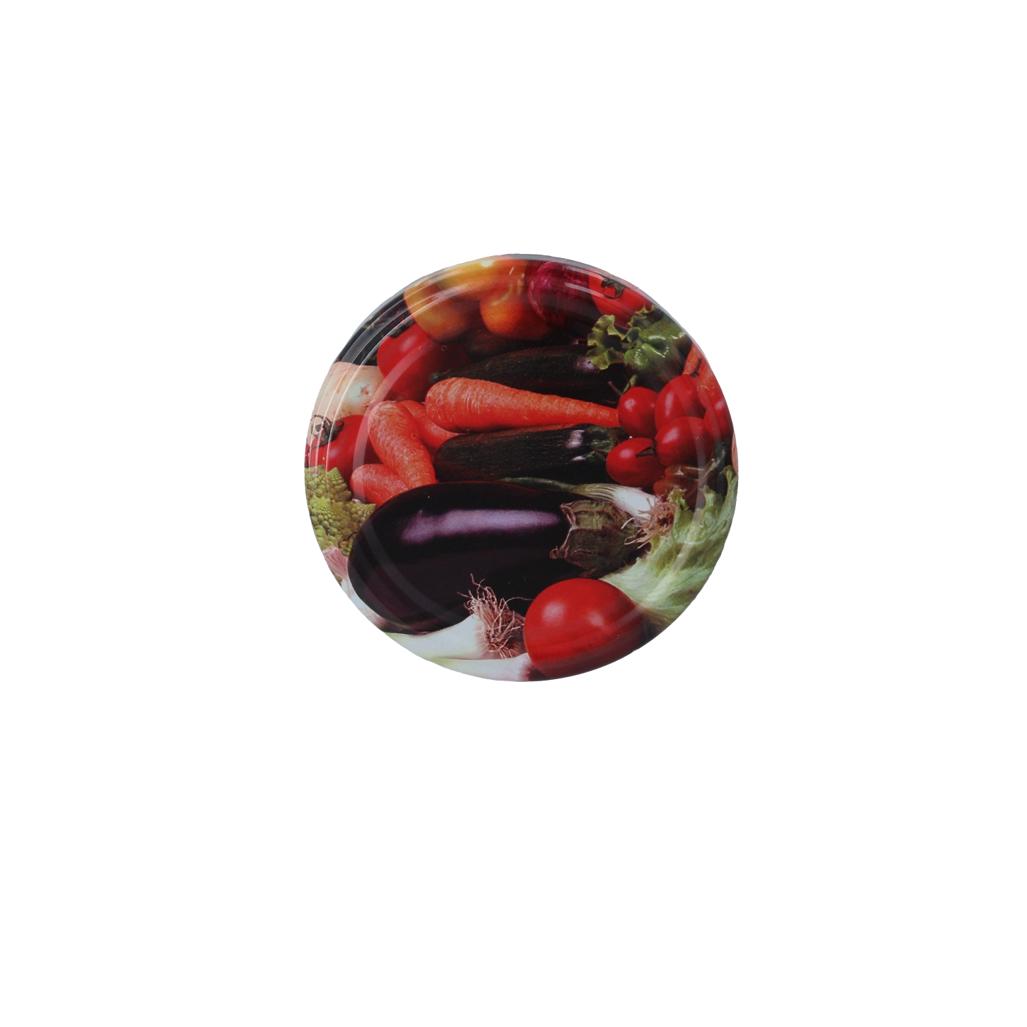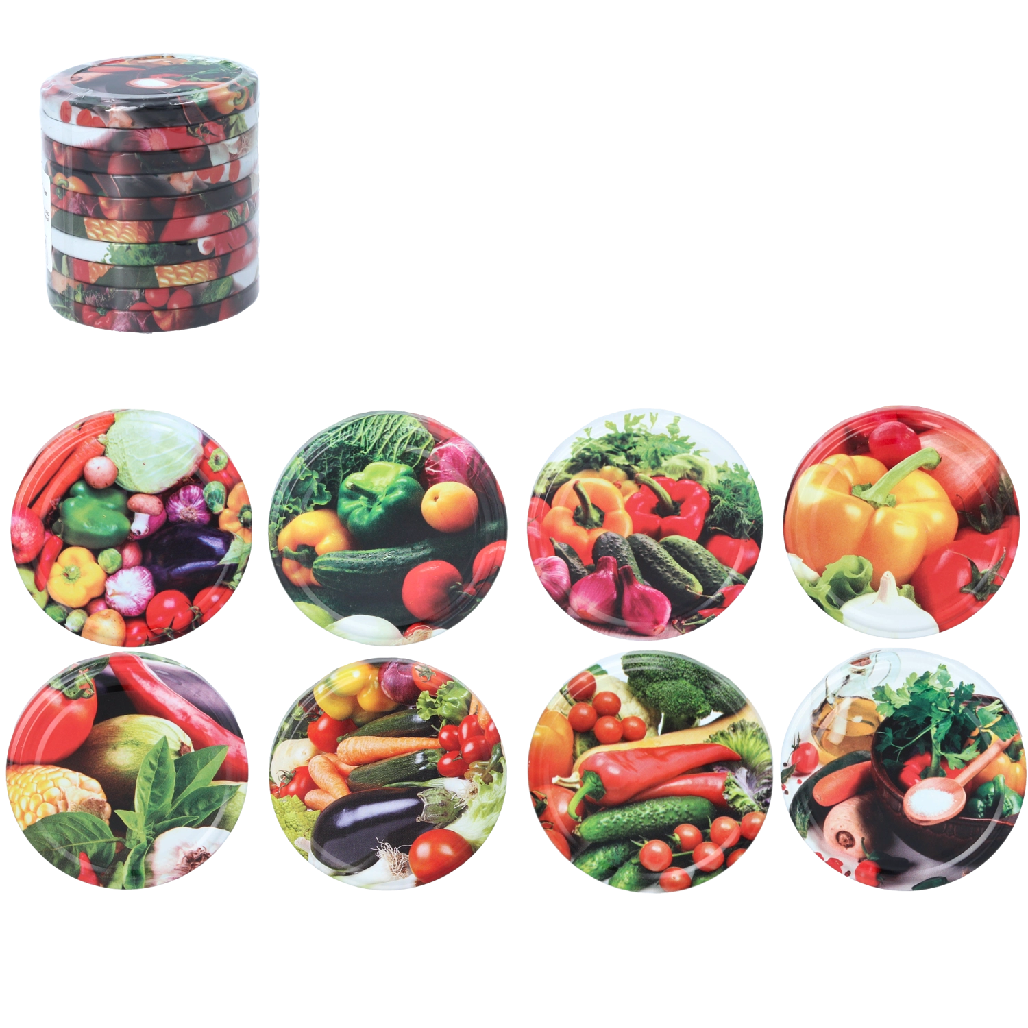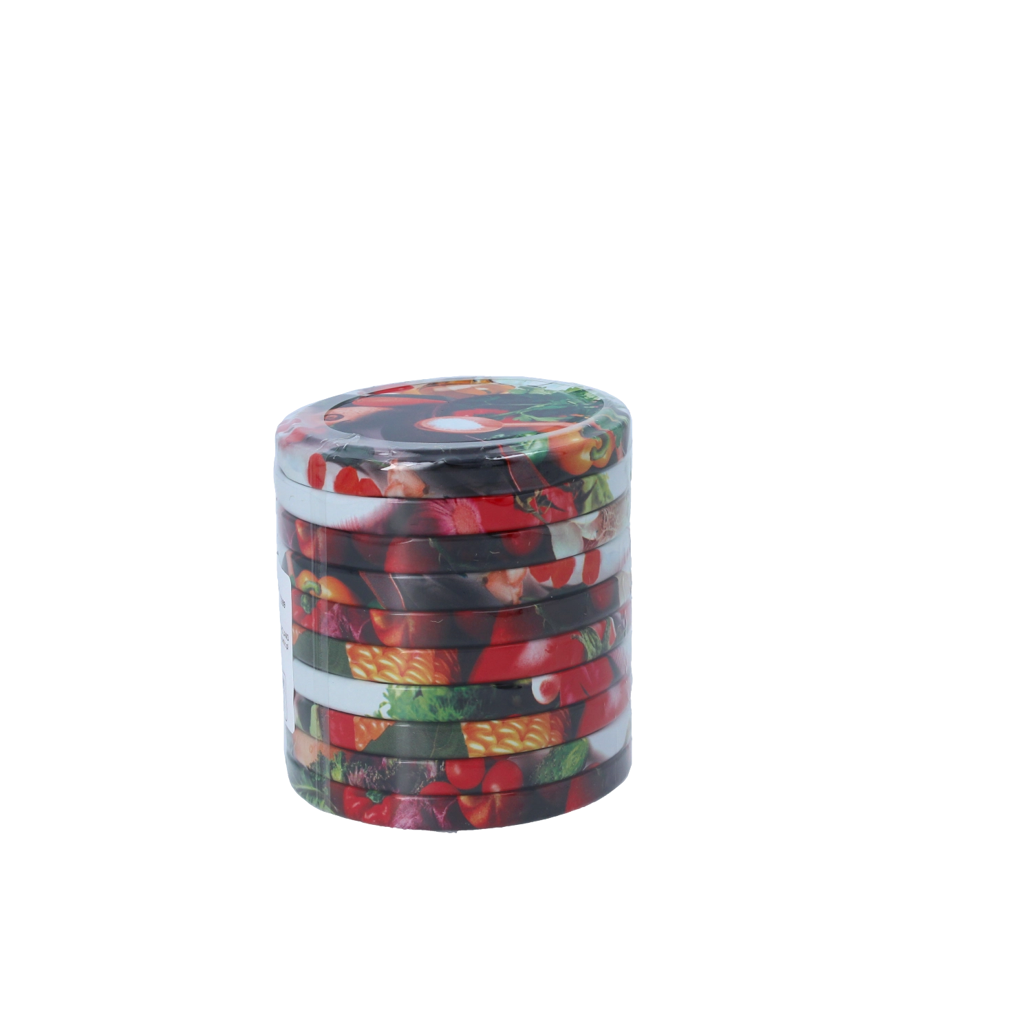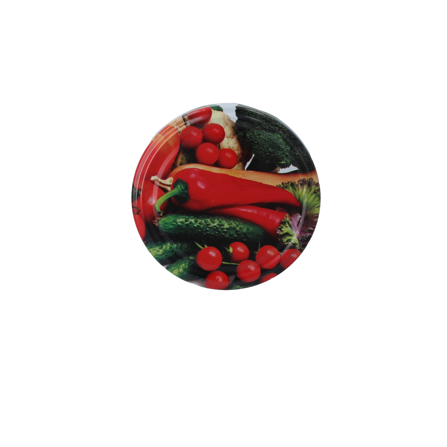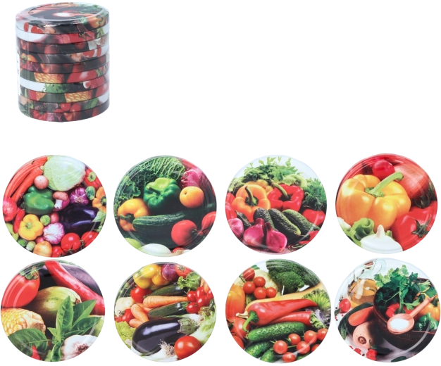 Kiváló minőségű fémből készültek, amely alkalmas élelmiszerrel való érintkezésre, és véd a kiszáradástól, nedvességtől és oxidációtól. A fényes felület színes zöldséges mintával letisztult, esztétikus megjelenést ad bármelyik konyhában. A fedelek többszöri használatra és könnyű karbantartásra készültek.