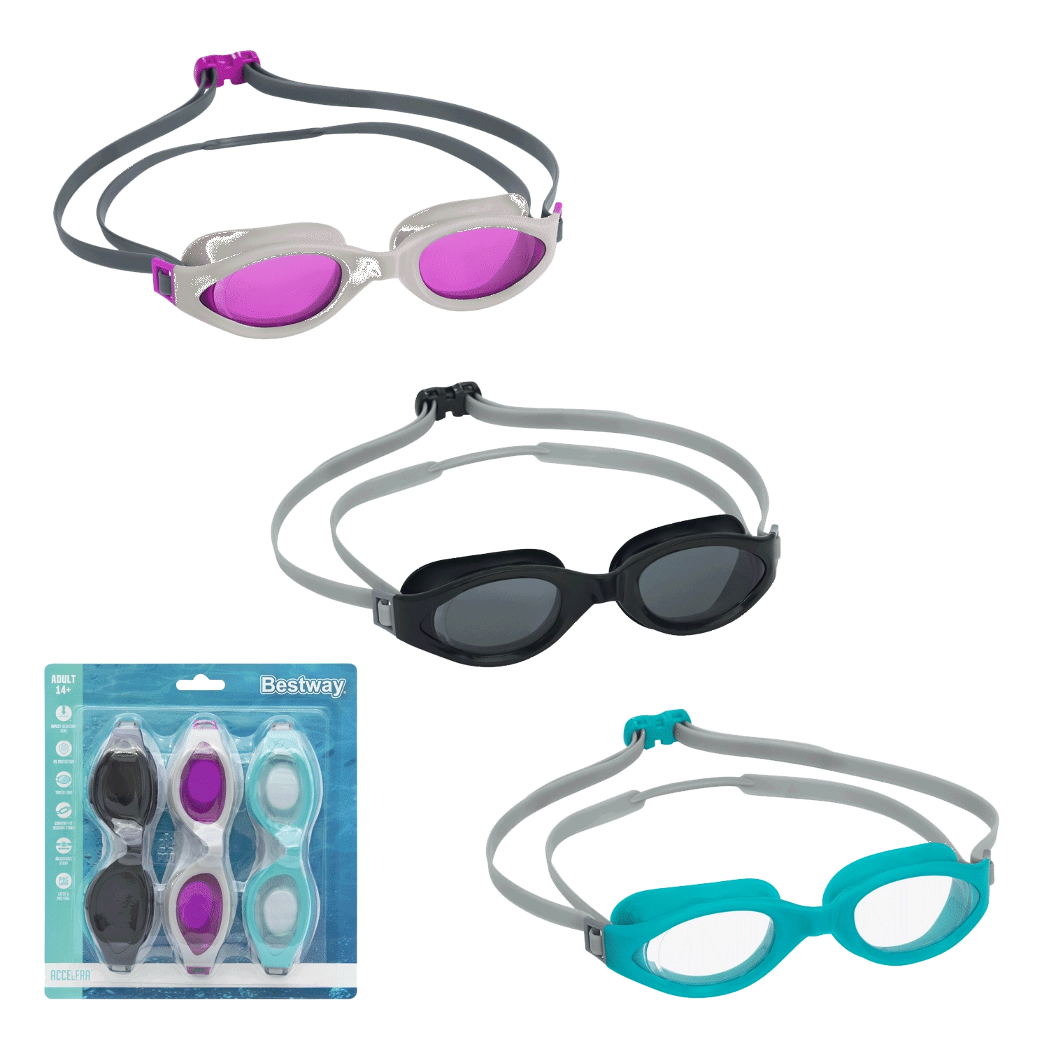 A BESTWAY Accelera úszószemüveg tinédzsereknek és felnőtteknek (kb. 14+) készült. A csomagban 3 pár található, így hangulat szerint válthat színt, vagy megoszthatja a családdal. A színezett lencsék UV-szűrővel védenek a szabadtéri úszásnál, a tartós polikarbonát pedig jobban bírja az ütődéseket és a mindennapos használatot.