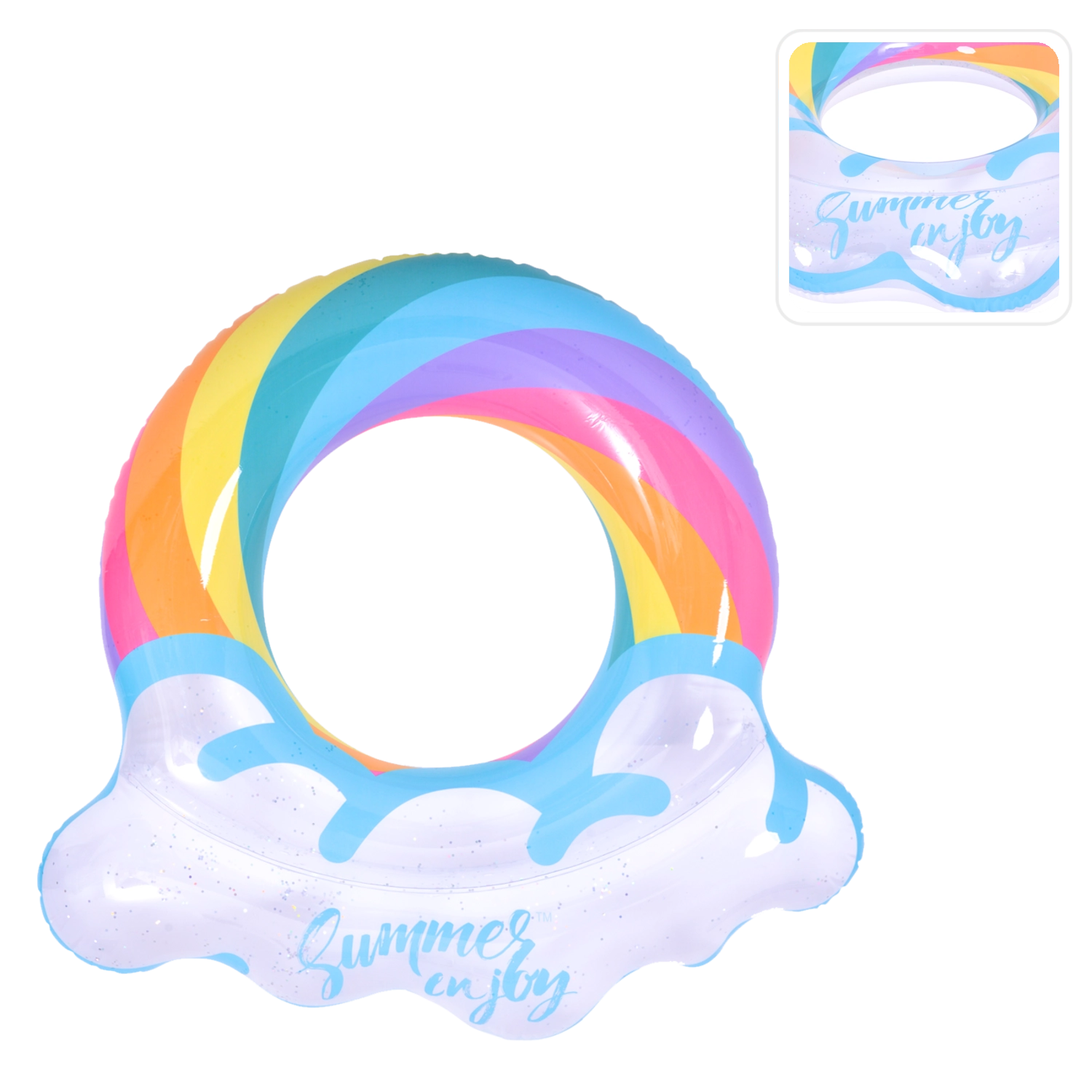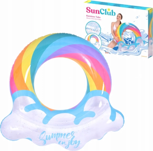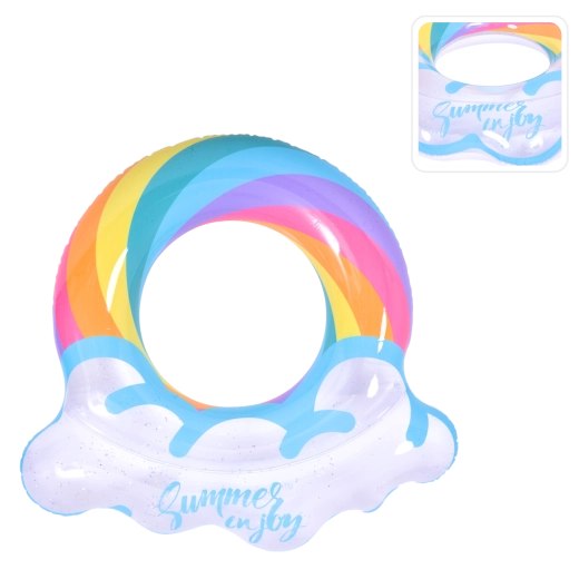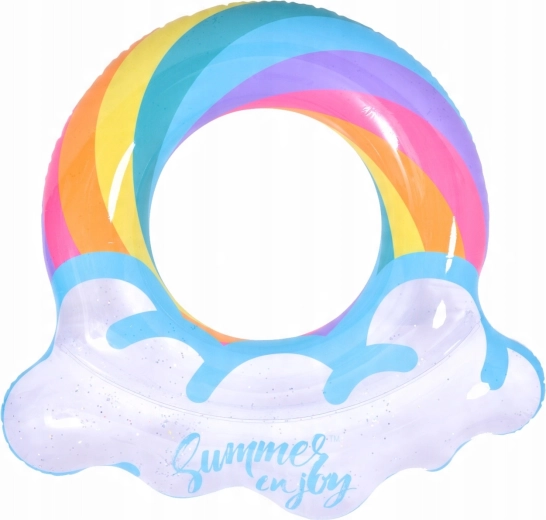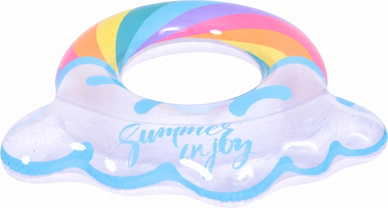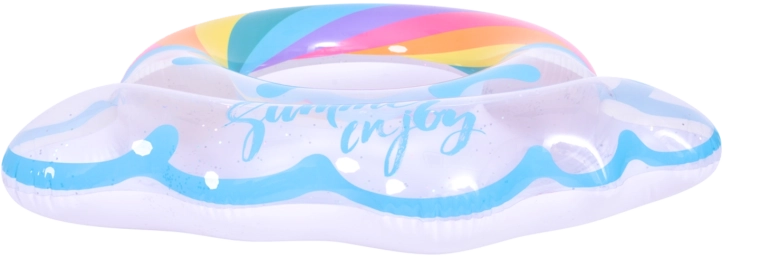 A szivárvány mintás, felhős szélű felfújható úszógumi tökéletes társ a nyári szórakozáshoz. Az átlátszó test színes csíkokkal és csillogó részecskékkel kiváló láthatóságot biztosít a vízen, és minden fotón remekül mutat. A masszív vinil szerkezetnek köszönhetően ellenáll a kopásnak és a mindennapos használatnak.