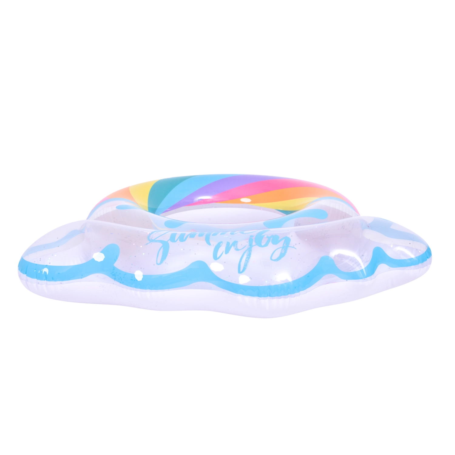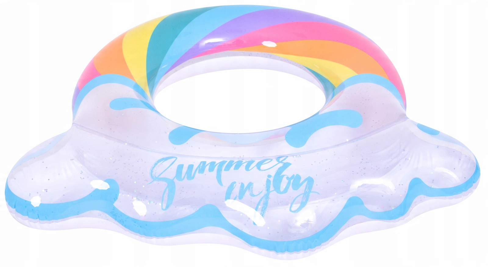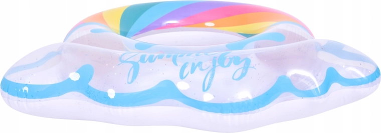 Élvezd a nyarat ezzel a stílusos, szivárvány formájú felfújható úszógumival. Az átlátszó dizájn kék részletekkel és csillogó flitterekkel extra ragyogást ad a vízi szórakozásnak. Ideális medencébe és tengerpartra, tartós vinilből készül a hosszú élettartamért és a biztonságos úszáshoz és relaxáláshoz. A nagy, 106,5 × 103 cm-es átmérő kényelmet nyújt tiniknek és felnőtteknek 12+.