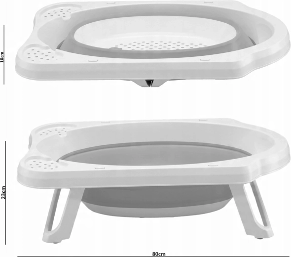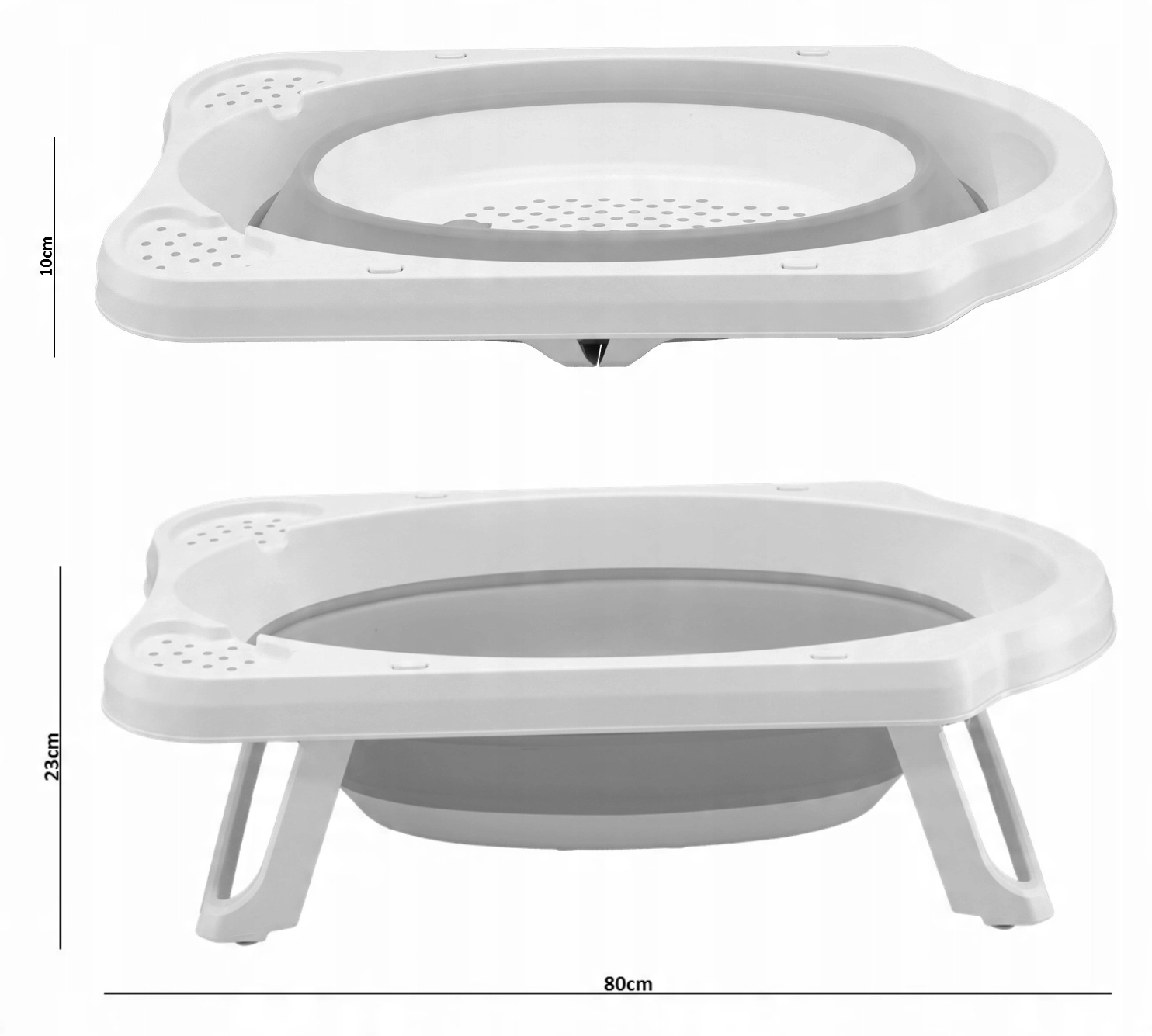 A tágas, 80 × 45,5 × 24 cm-es méreteknek köszönhetően újszülött kortól kisgyermekkorig megfelelő. Az anyag könnyen tisztítható, a kád néhány másodperc alatt használatra kész, és a fürdetés után gyorsan összecsukható.