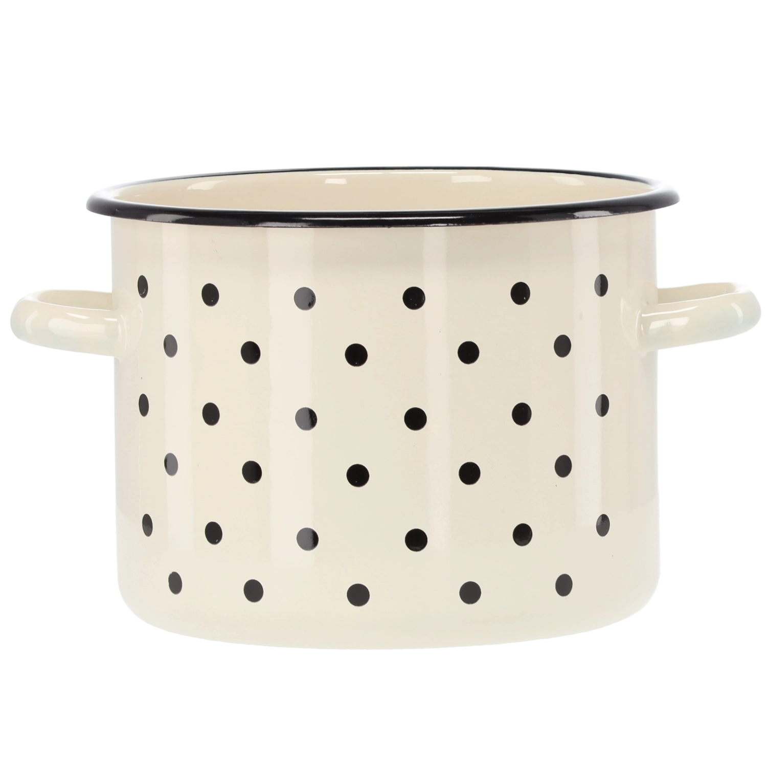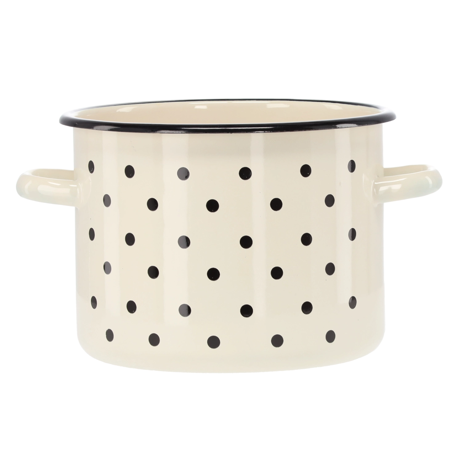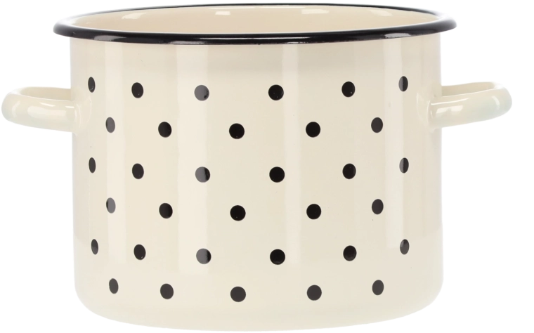 Stílusos, 4,5 l űrtartalmú és 20 cm átmérőjű zománcozott fazék fehér színben, elegáns pöttyökkel. A tartós zománcfelület higiénikus, könnyen tisztítható, és ideális a mindennapi főzéshez.