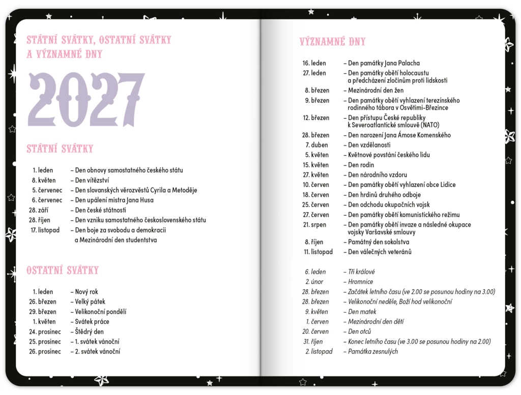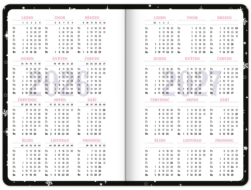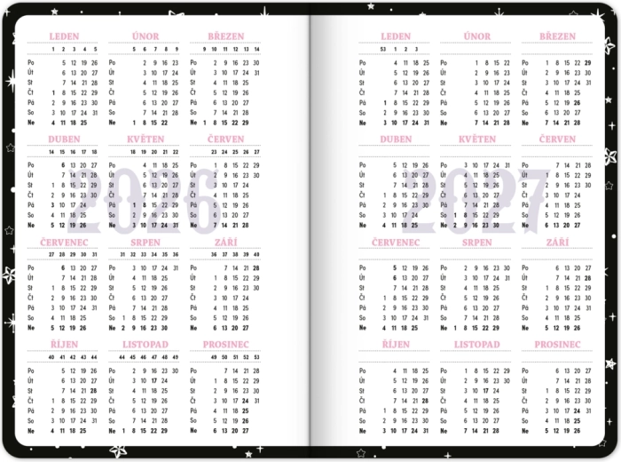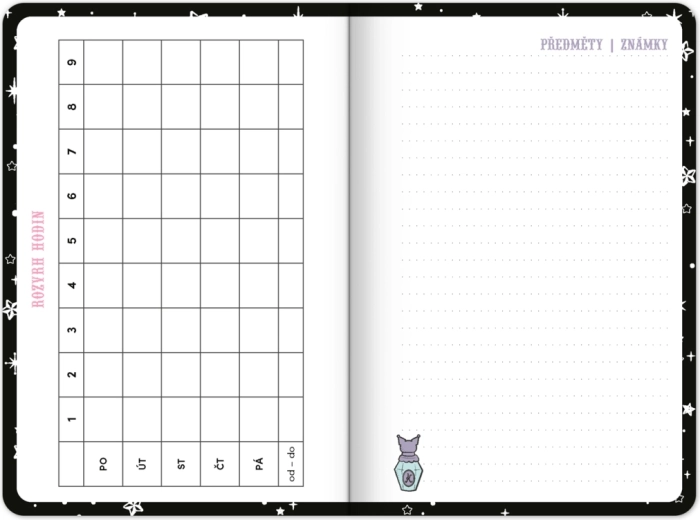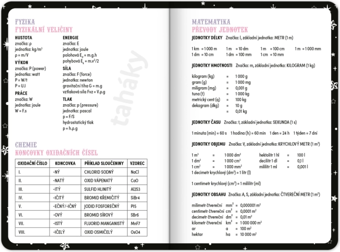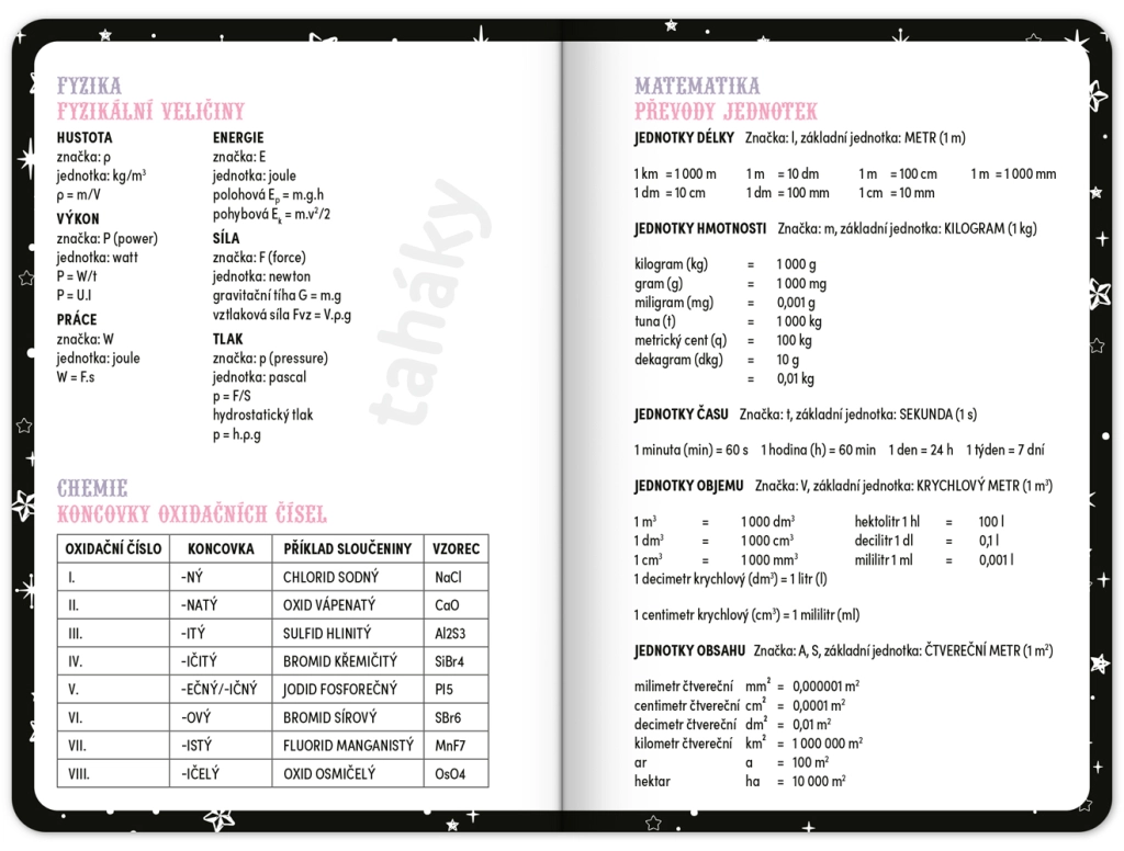 A naptár része több hasznos segédlet, amelyek időt spórolnak tanulás és tervezés közben. Találsz benne puskákat matematikából, fizikából, kémiából és angolból, órarendeket a gyors eligazodáshoz és a szünidők időpontjainak áttekintését. A napok és hetek áttekinthető elrendezése segít kézben tartani a dolgozatokat, feladatokat és a szabadidőt.