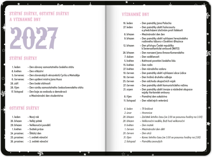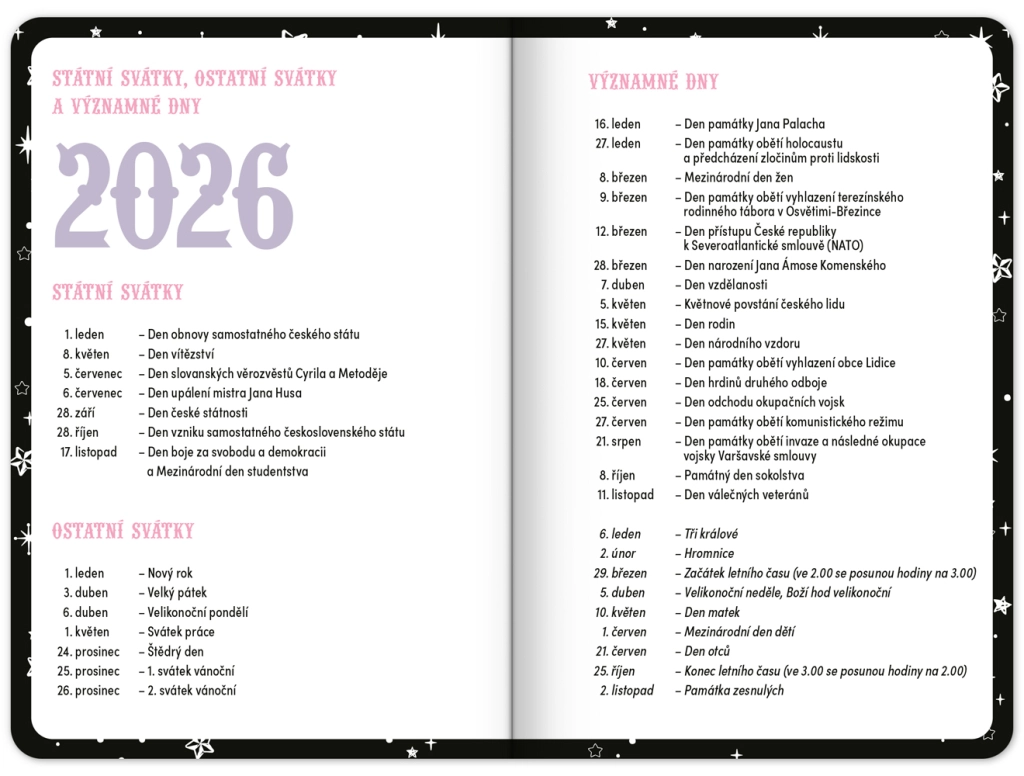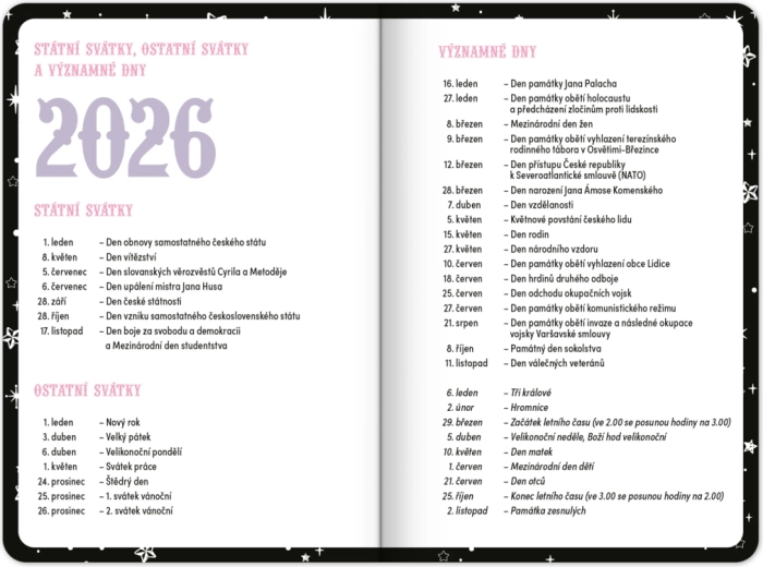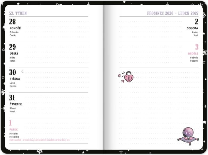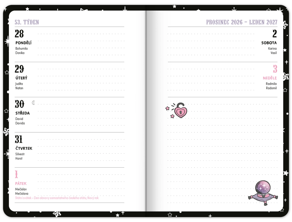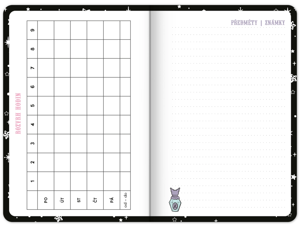 Stílusos diáknaptár KUROMI motívummal iskolásoknak és egyetemistáknak a 2026 szeptember – 2027 december időszakra. Praktikus puskákkal matematikából, fizikából, kémiából és angolból, órarend áttekintéssel és szünidő-időpontok összefoglalójával. A kompakt 9,8 × 14,5 cm méret minden hátizsákba és táskába belefér.