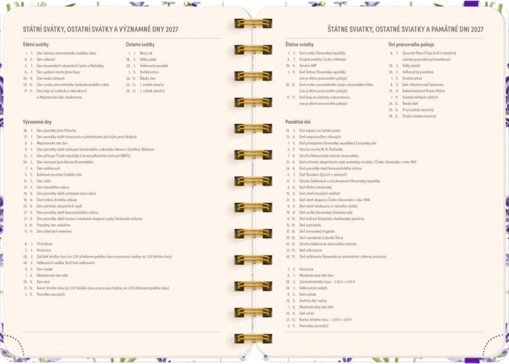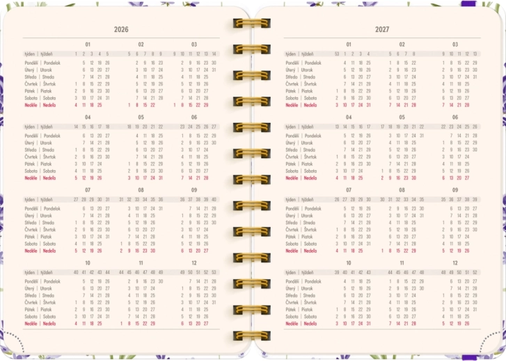 A cseh–szlovák heti vonalas kalendárium névnapokkal és ünnepekkel megkönnyíti az időbeosztást munkában és otthon. Minden hét dedikált helyet kínál jegyzeteknek, feladatoknak vagy fontos határidőknek, míg a 2026-os és 2027-es éves áttekintők gyors tájékozódást nyújtanak hosszabb távon.