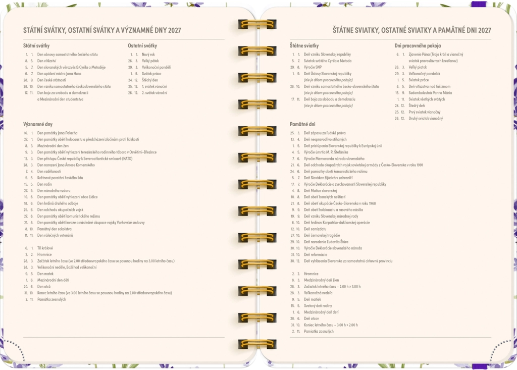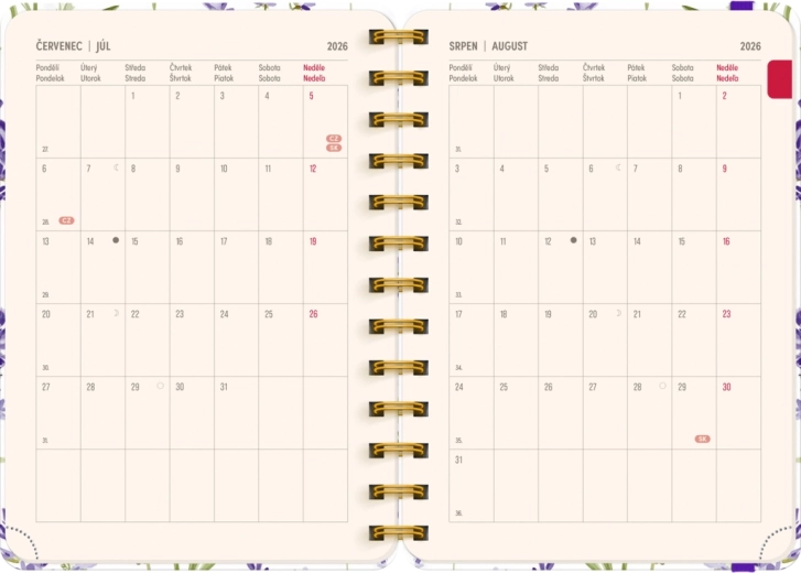 Elegáns, 18 hónapos Petito határidőnapló levendula motívummal, amely áttekinthetőséget és stílust kínál a tervezéshez 2026 júliusától 2027 decemberéig. Heti vonalas kalendáriumot tartalmaz cseh és szlovák névnapokkal és ünnepekkel, havi áttekintőket 2026-ra és 2027-re, valamint bőséges helyet jegyzeteknek minden héten.