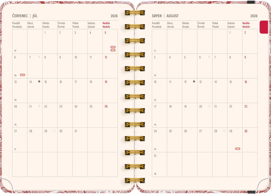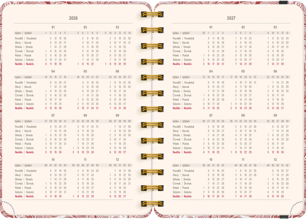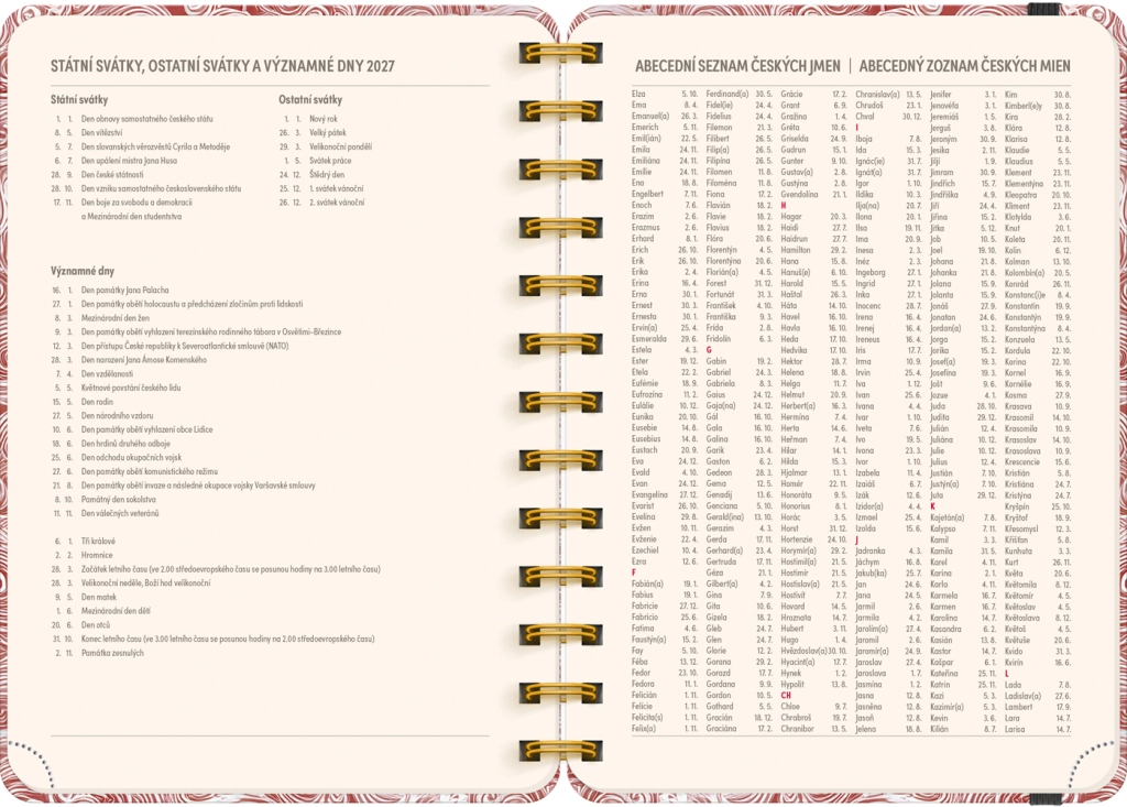 A napló mindent tartalmaz a hatékony időmenedzsmenthez: 2026 és 2027 éves áttekintései, cseh és szlovák utónevek jegyzéke, valamint bőséges hely a jegyzeteknek minden héten. A Felhők motívum könnyedséget és átláthatóságot kölcsönöz a terveinek.