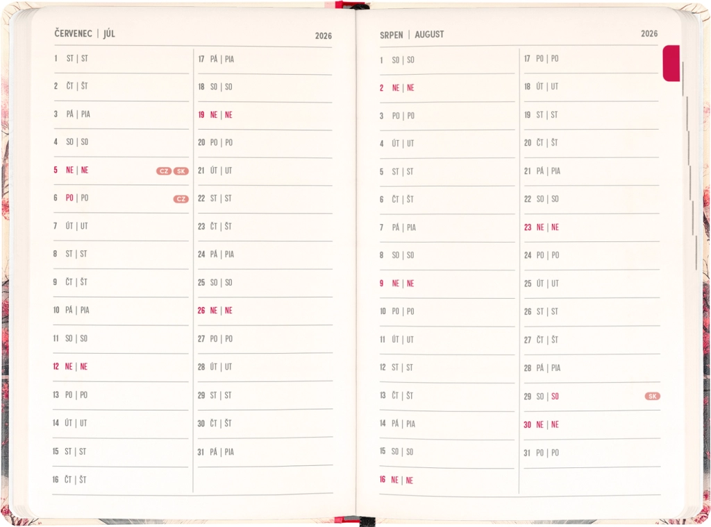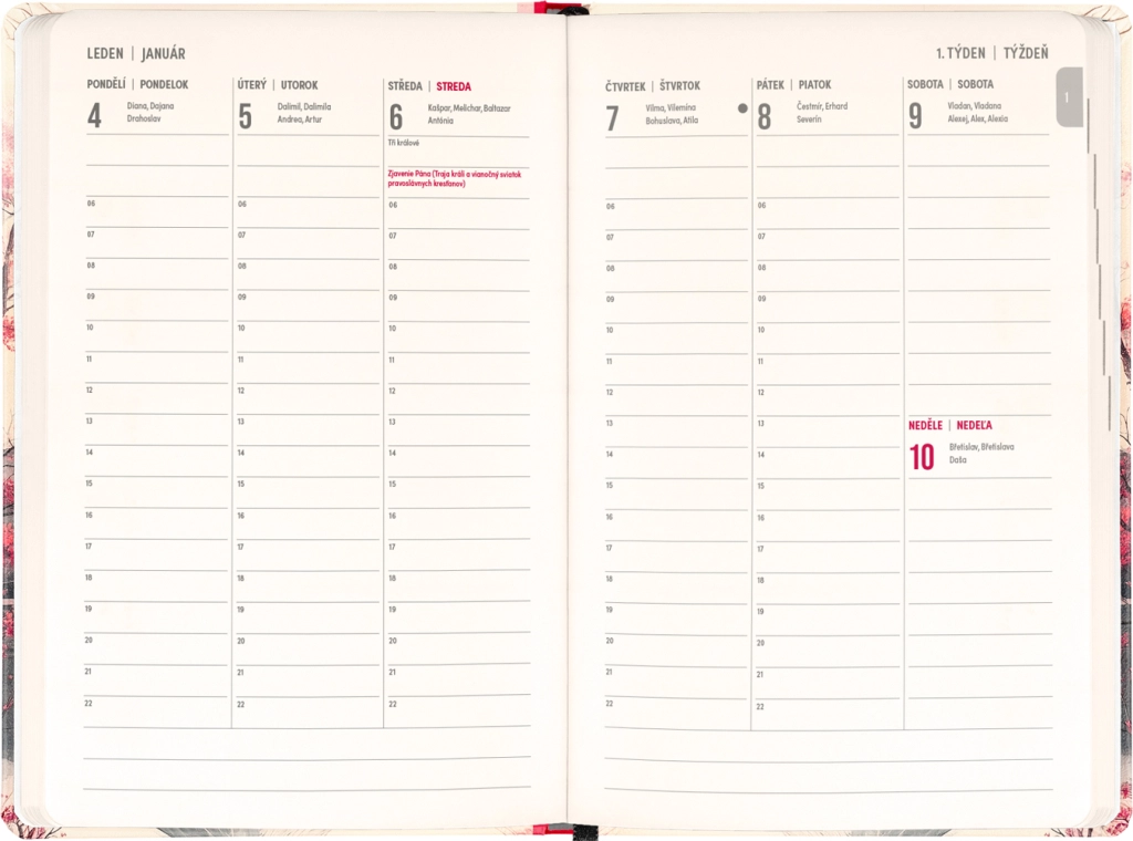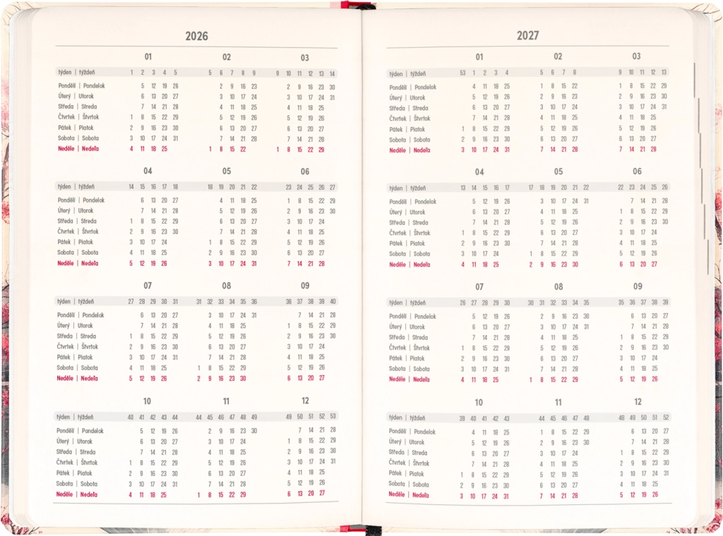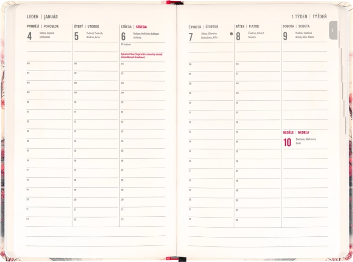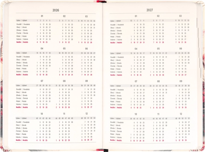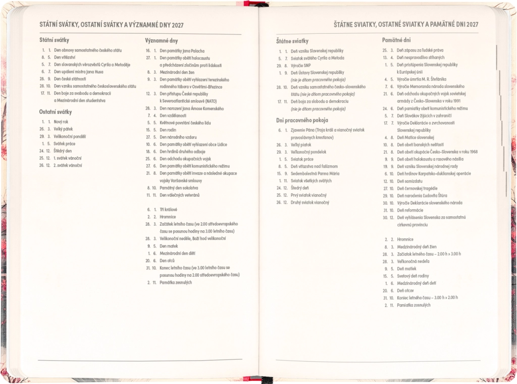A napló a mindennapi tervezésre és az ünnepi alkalmakra is gondol: megtalálja benne a 2026 és 2027 éves áttekintést, a cseh és szlovák névjegyzéket, valamint a ünnepnapok emlékeztetőit. Az áttekinthető, napokra bontott oszlopok megkönnyítik a munka, az iskola és a szabadidő szervezését.