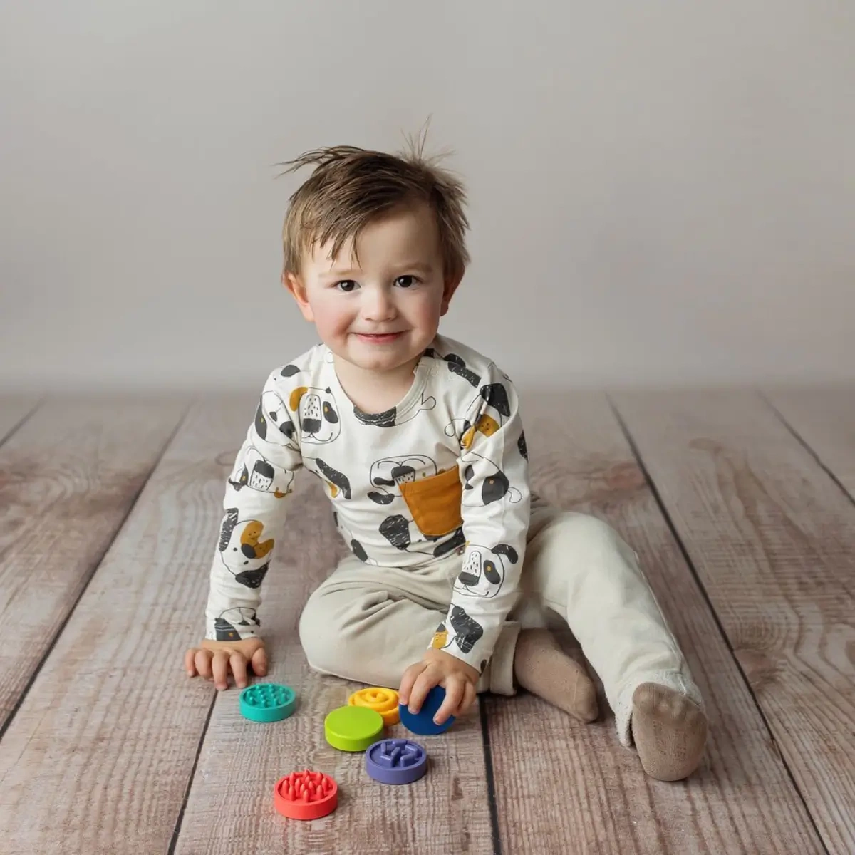 Színes korongok különböző felületekkel, amelyek támogatják a textúrák, színek és formák felismerését. A gyerekek játékos módon erősítik a tapintásos észlelést és a koncentrációt.