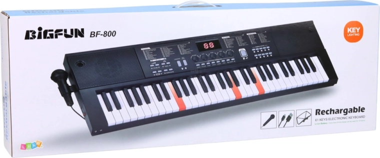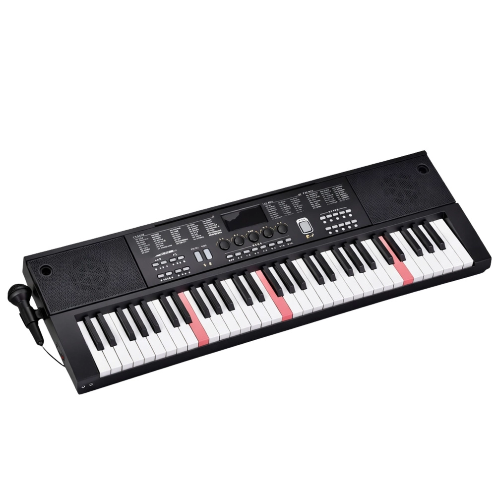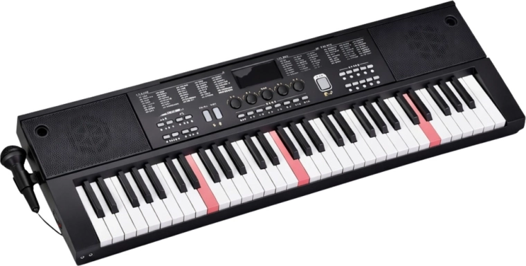 Univerzális elektronikus billentyűzet 61 billentyűvel, 200 hangszínnel, 200 kísérettel és 70 demódallal, ideális kezdőknek és haladóknak. Kínál Key Light billentyűmegvilágítást a könnyebb tanuláshoz, áttekinthető LCD kijelzőt, oktatási módokat: One Key, Follow, Guide, valamint USB-s tápellátást. A csomagban mikrofon és kottatartó is található.