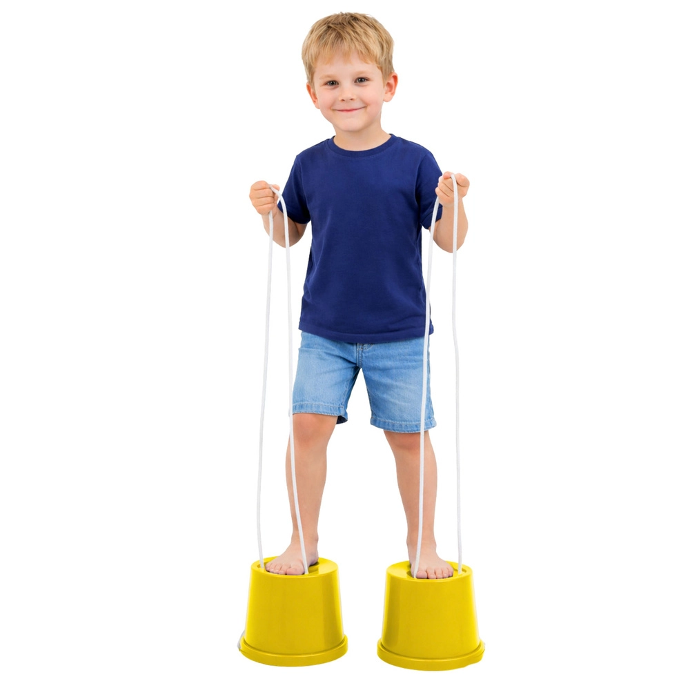 A vidám, élénk sárga színű vödlibakancsok segítik a gyerekeket a egyensúly, a koordináció és a ügyesség fejlesztésében. A masszív műanyag kivitelnek és a fogózsinóroknak köszönhetően stabilak, könnyen kezelhetők, és ideálisak aktív játékhoz kültéren és beltéren egyaránt.