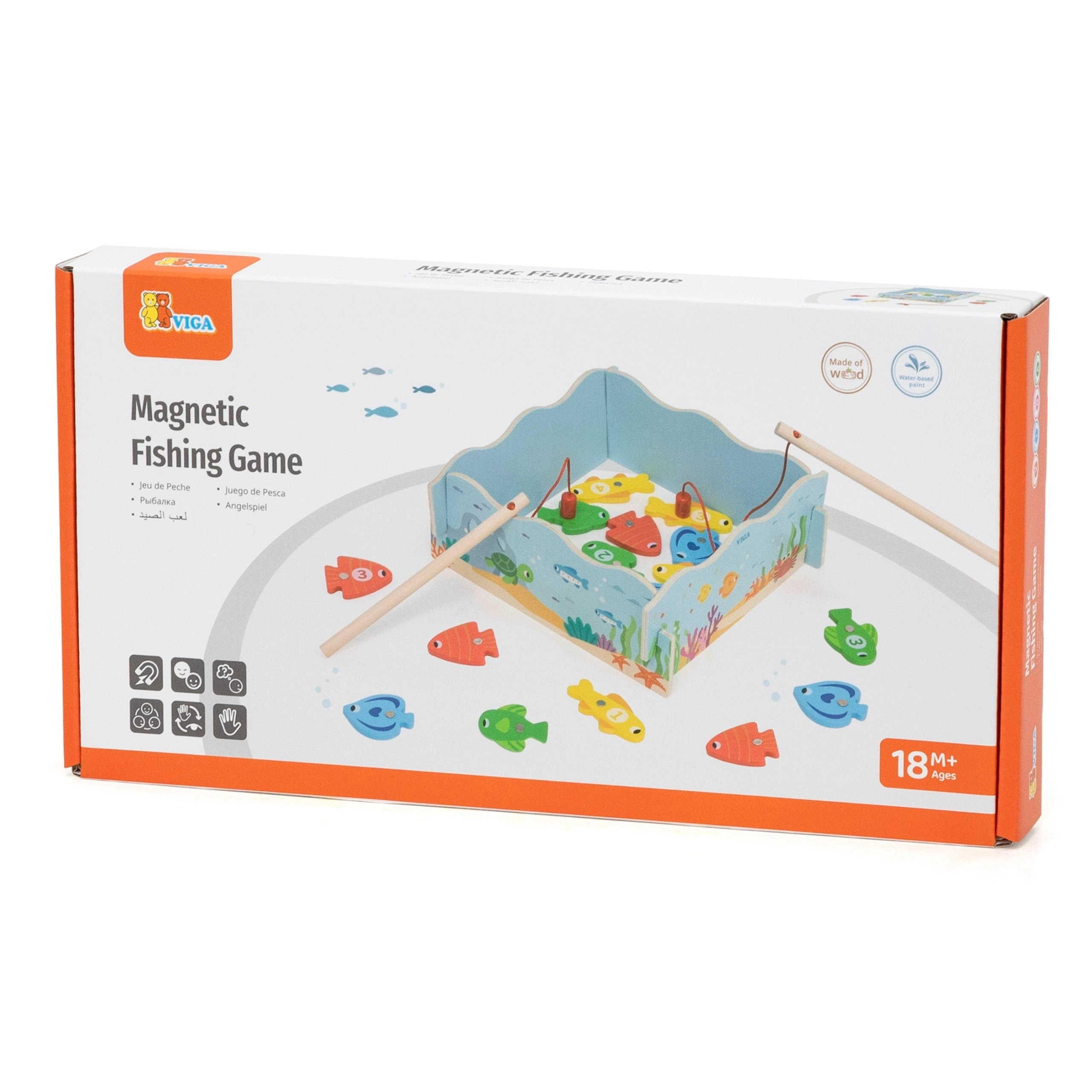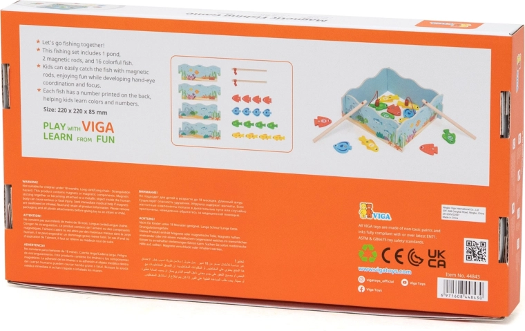 Fogd ki a színes halacskákat és tanulj játékkal! A VIGA fa mágneses horgászjátéka biztonságos mágneses horgászást kínál, számozott halacskákkal a számok és színek tanulásához, valamint masszív fa kivitelben. Ideális 18 hónapos kortól, fejleszti a finommotorikát, a kéz–szem koordinációt és a türelmet. A praktikus „tócska” egyben tárolódobozként is szolgál.
