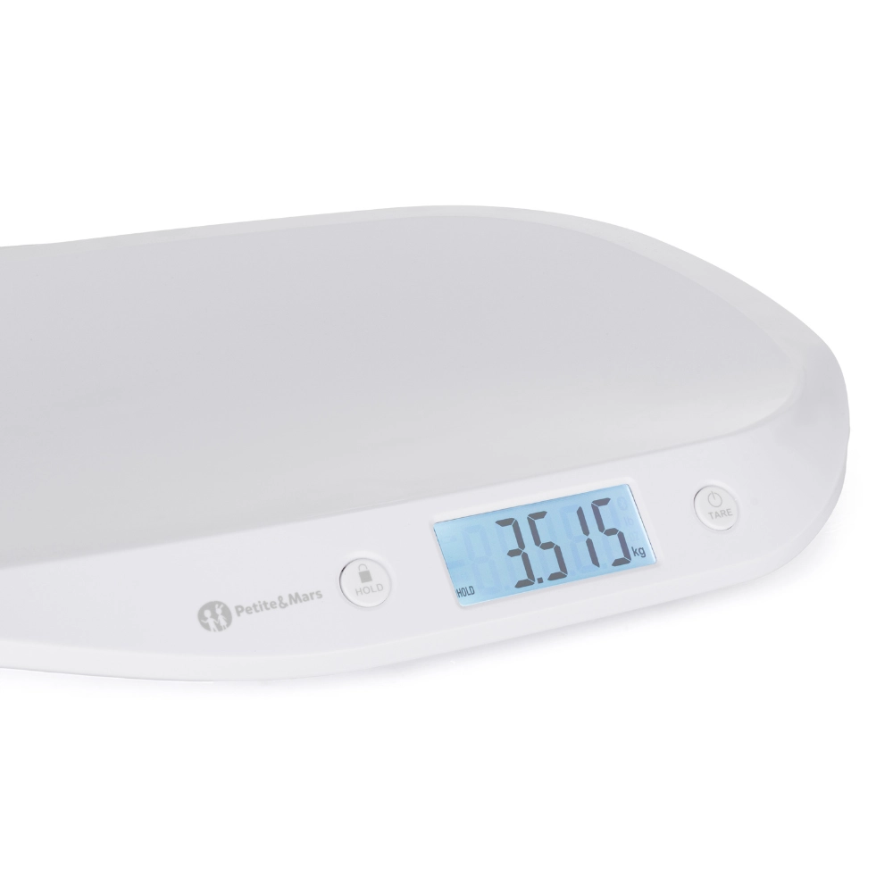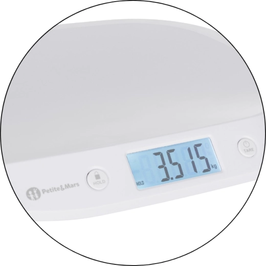 A PETITE&MARS Balance mérleg praktikus segítőtárs a baba életének első napjaitól. A nagy, háttérvilágított LCD kijelző kiváló olvashatóságot biztosít nappal és éjszaka is, míg a HOLD funkció (automatikus és manuális) rögzíti és megjeleníti a stabil értéket akkor is, ha a baba természetesen mozog. A TARE funkciónak köszönhetően egyszerűen levonhatja a törölköző vagy takaró tömegét, így pontos eredményt kap.