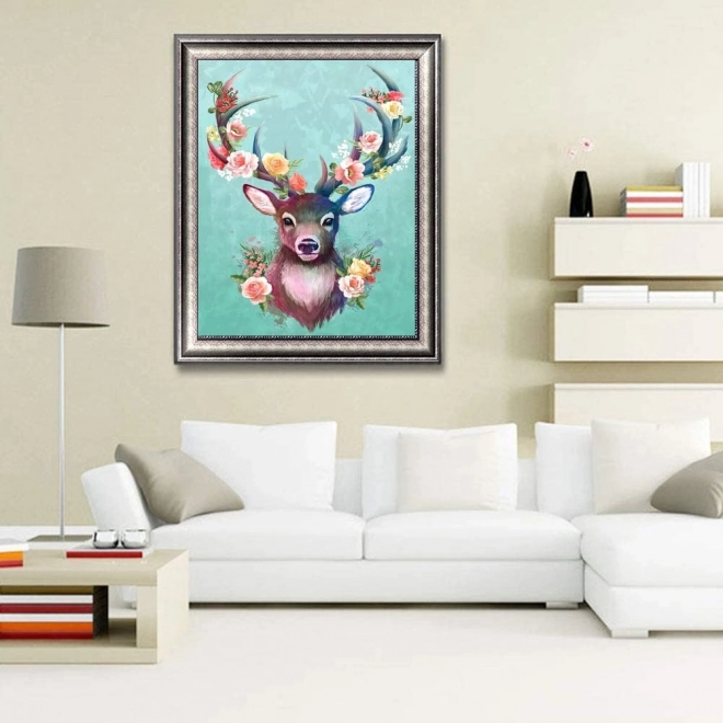 Élénk színpaletta és a szarvasagancson lévő virágdíszítés hoz létre feltűnő, ragyogó képet, amely bármely enteriőr éke lesz.