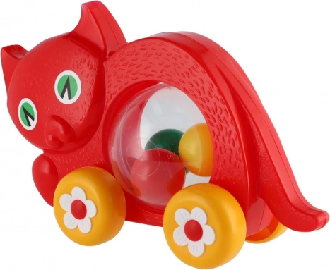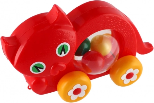 Húzható cica mozgó labdákkal a legkisebbeknek. Tartós műanyag, méret 27×16×10 cm, 12 hónapos kortól. Szórakozás és motorikafejlesztés az első lépésekhez.