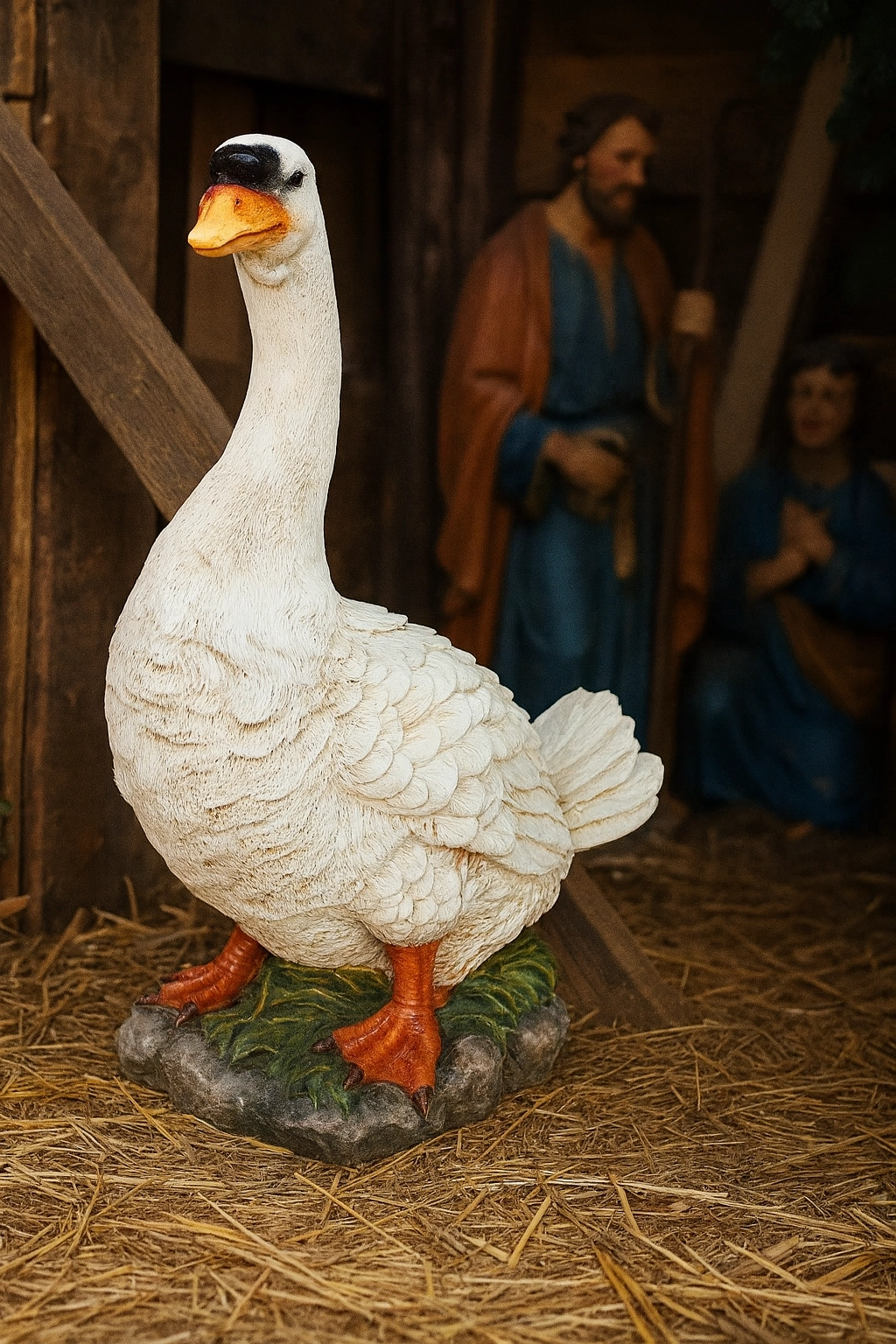 Alkoss hatásos ünnepi kompozíciót a realisztikus 51 cm-es libafigurával, amely remekül kiegészíti a betlehemet, kirakatot vagy tematikus installációt. A precíz tollstruktúra, narancssárga csőr és lábak, valamint a természetes, füves talapzat hiteles és esztétikailag letisztult hatást kelt.