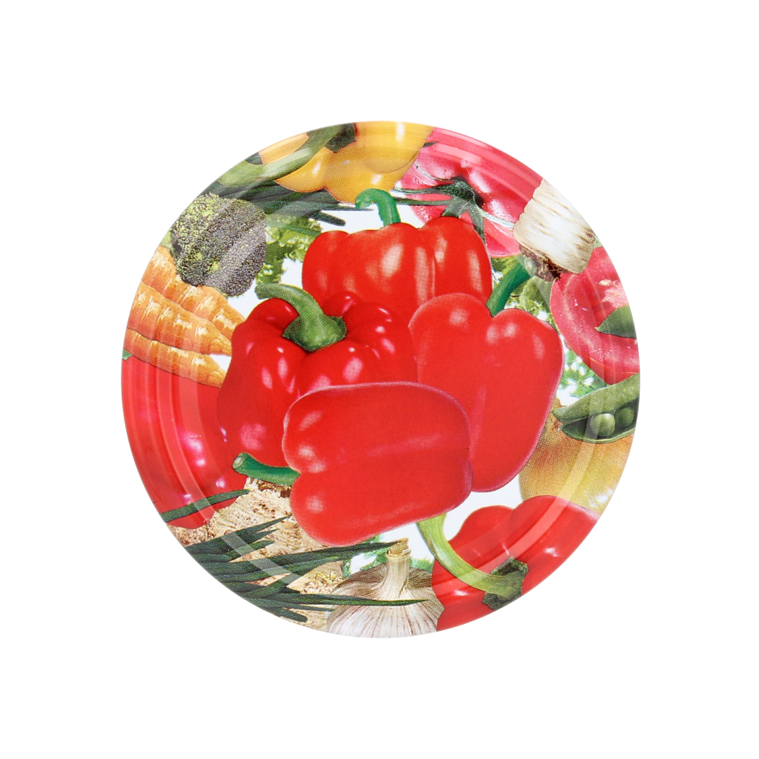 Praktikus, 82 mm átmérőjű fém tető 6 rögzítési ponttal a szilárd és tömített záráshoz házi befőttekhez. A paprika és zöldség dekor vonzó megjelenést kölcsönöz az üvegeknek, pasztőrözésre és hosszú távú tárolásra alkalmas.