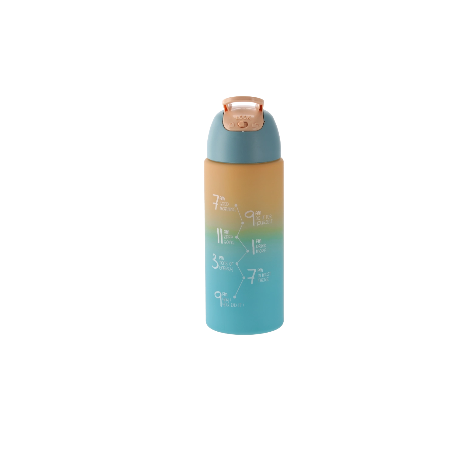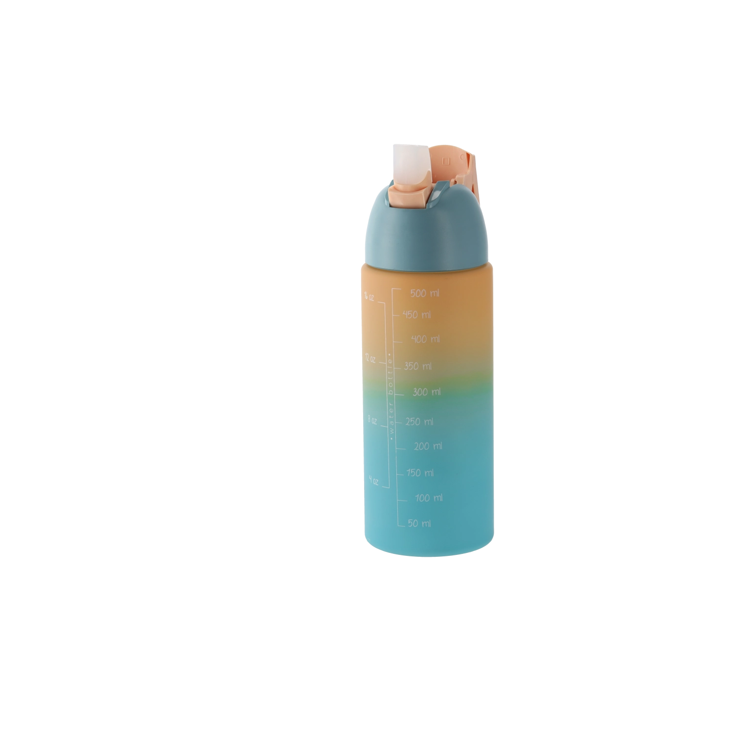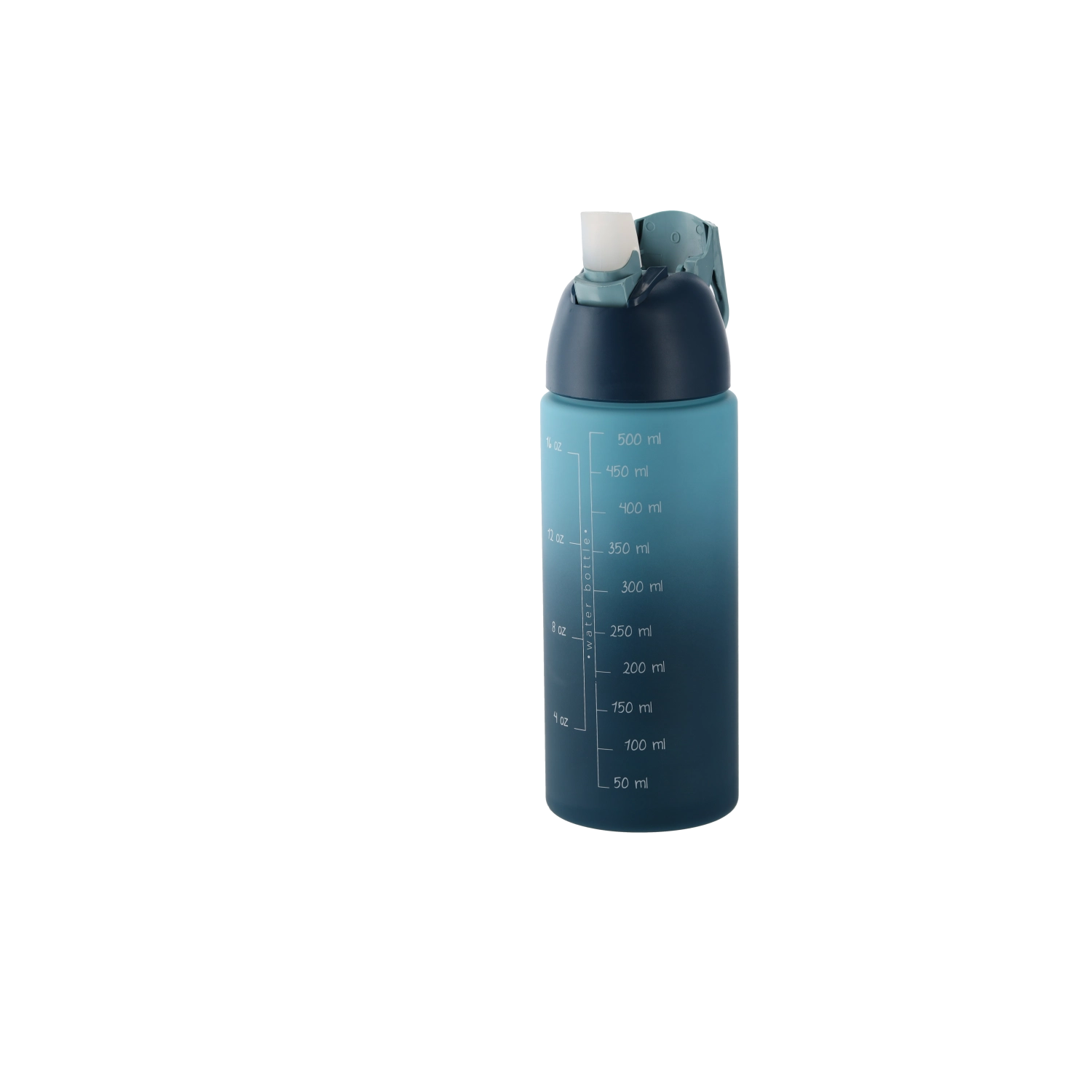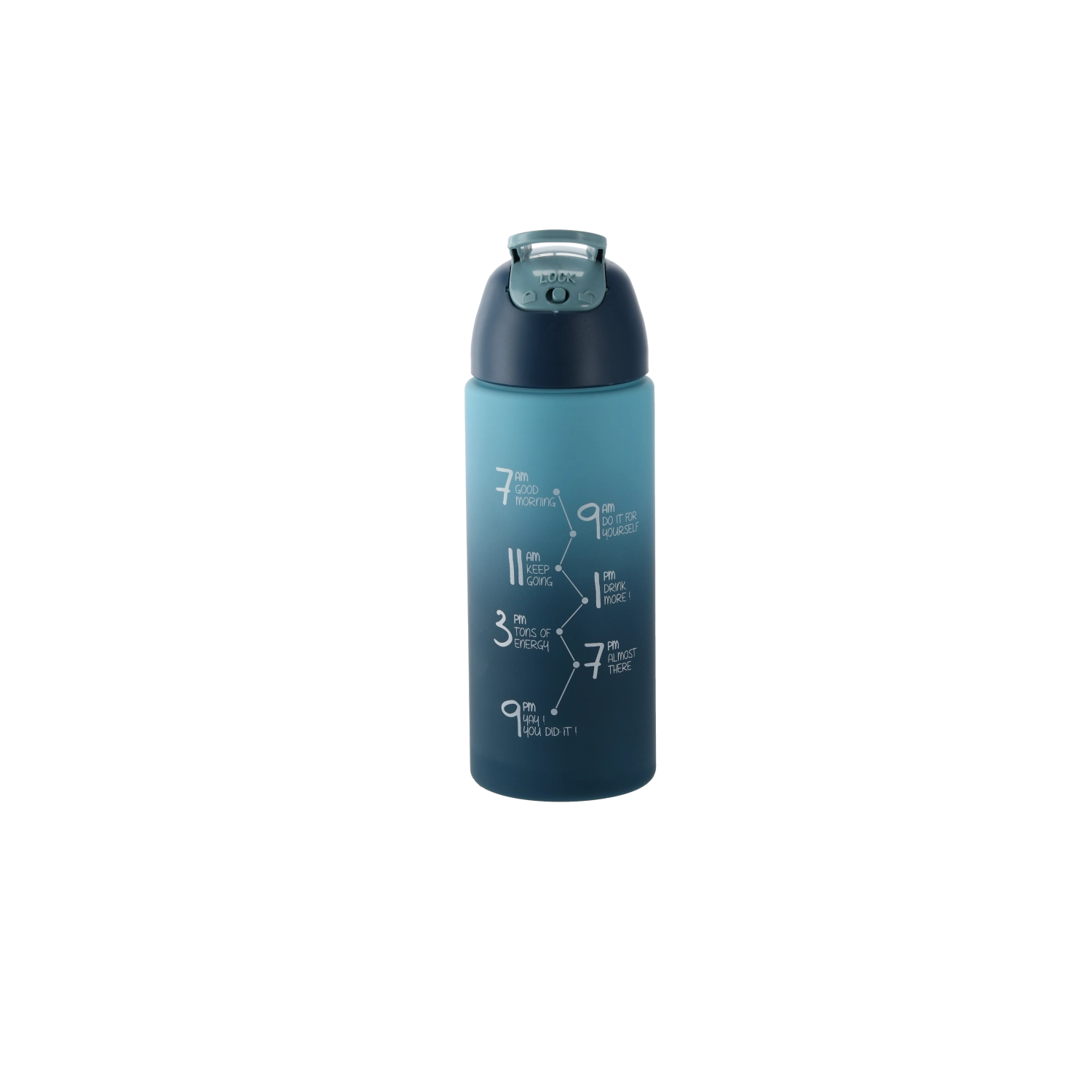 Stílusos, 500 ml űrtartalmú sportivópalack kék ombré kivitelben – ideális a mindennapi hidratáláshoz otthon, munkában és sport közben. A flip-top tető és a szivárgásmentes zár kényelmes, kilöttyenés nélküli ivást biztosít, az átlátszó test mércés skálával segít nyomon követni a folyadékbevitelt. A könnyű és tartós PC anyag utazáshoz és hátizsákba is megfelelő.