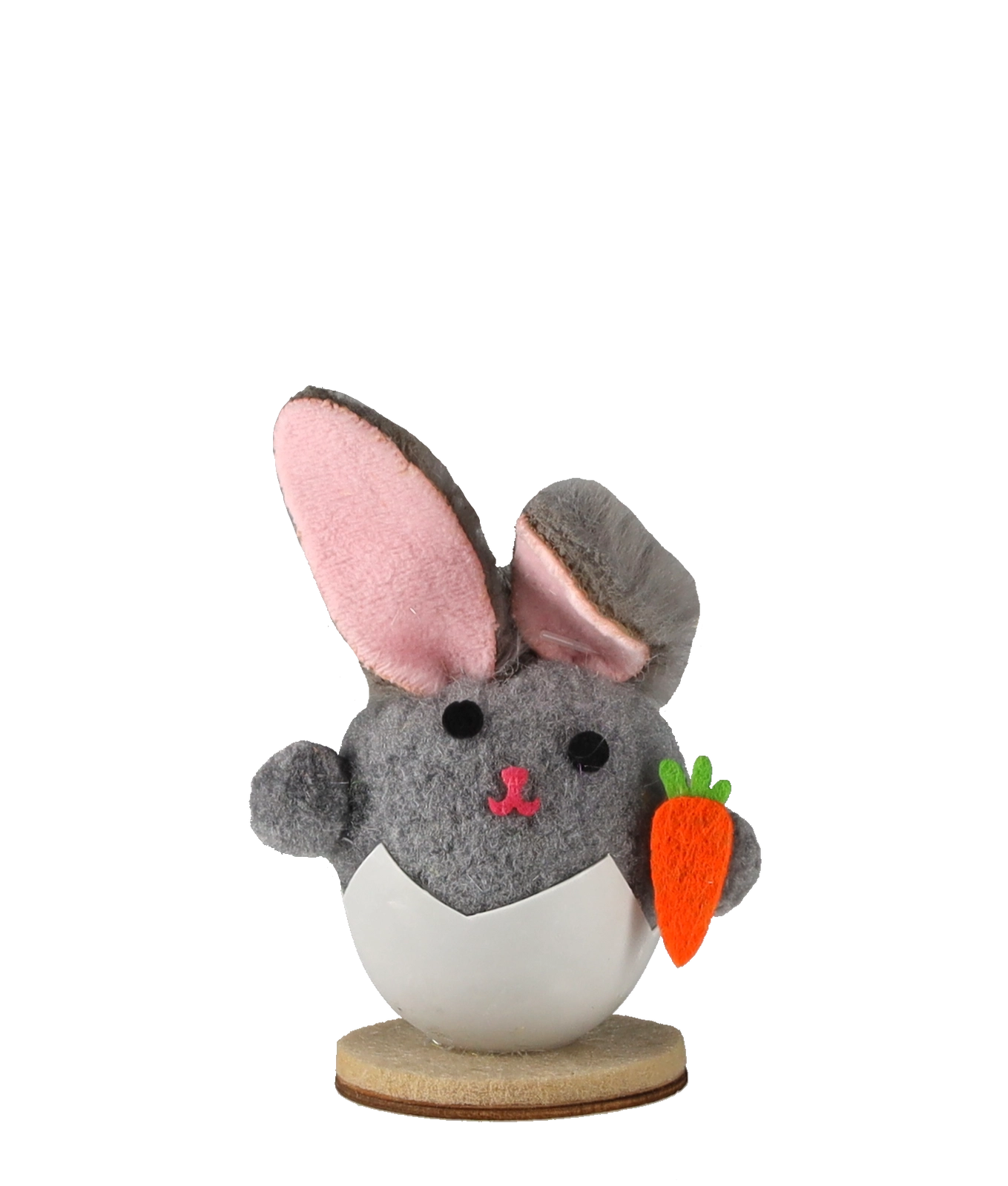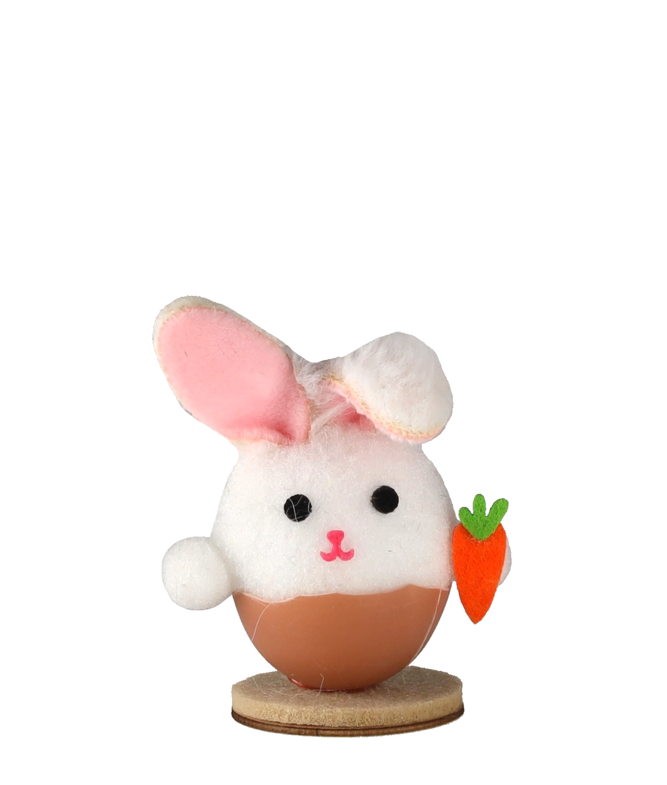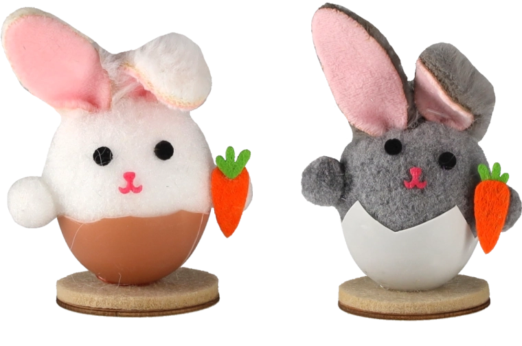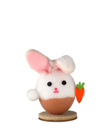 Ez a bájos húsvéti dekoráció egy tojáshéjból kikukucskáló nyuszit ábrázol – az új élet és a tavasz szimbólumát. A finom színek, a puha textil felület és a valósághű részletek (pofi, fülecskék, répa) minden enteriőrhöz elbűvölő kiegészítőt alkotnak.