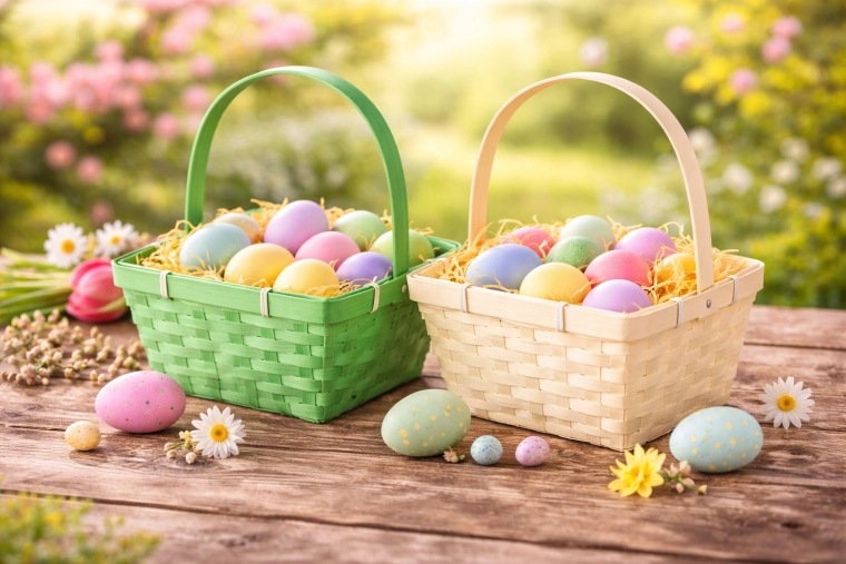A kosarak 2 szín mixében kerülnek szállításra, amelyek jól harmonizálnak, friss tavaszi hangulatot teremtve. Ideális otthoni dekorációhoz és ajándékcsomagoláshoz.