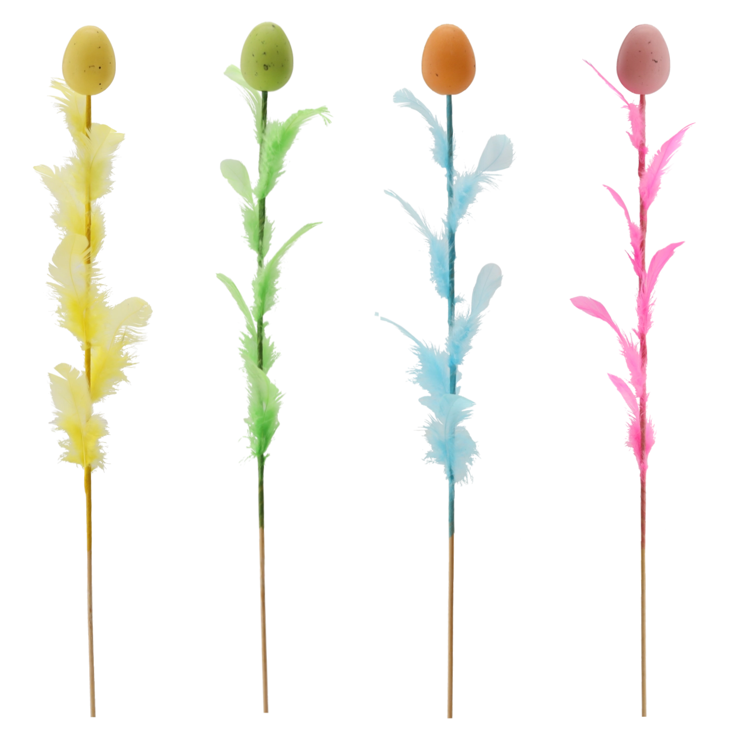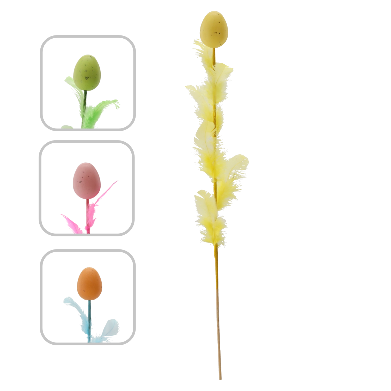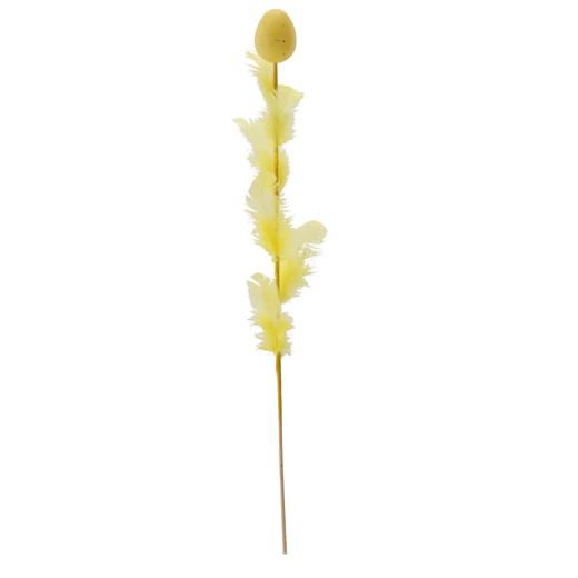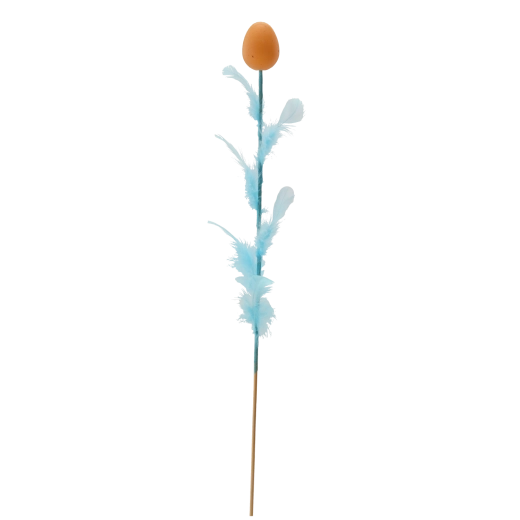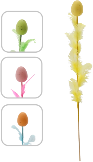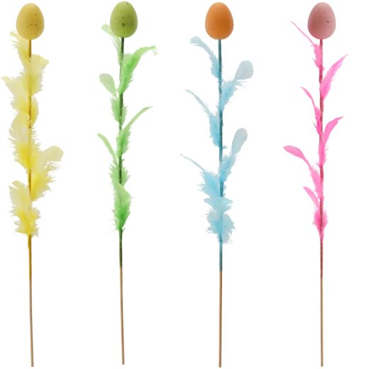 Elegáns húsvéti dekoráció tojás formában, tollakkal díszítve, 45 cm hosszú pálcán, amely feldobja ünnepi aranázsát. Négy friss szín keverékében kapható, amely színt és tavaszi hangulatot visz az enteriőrbe. A finom tollak légies könnyedséget kölcsönöznek, így ideális választás csokrokba, kosarakba és vázákba.
