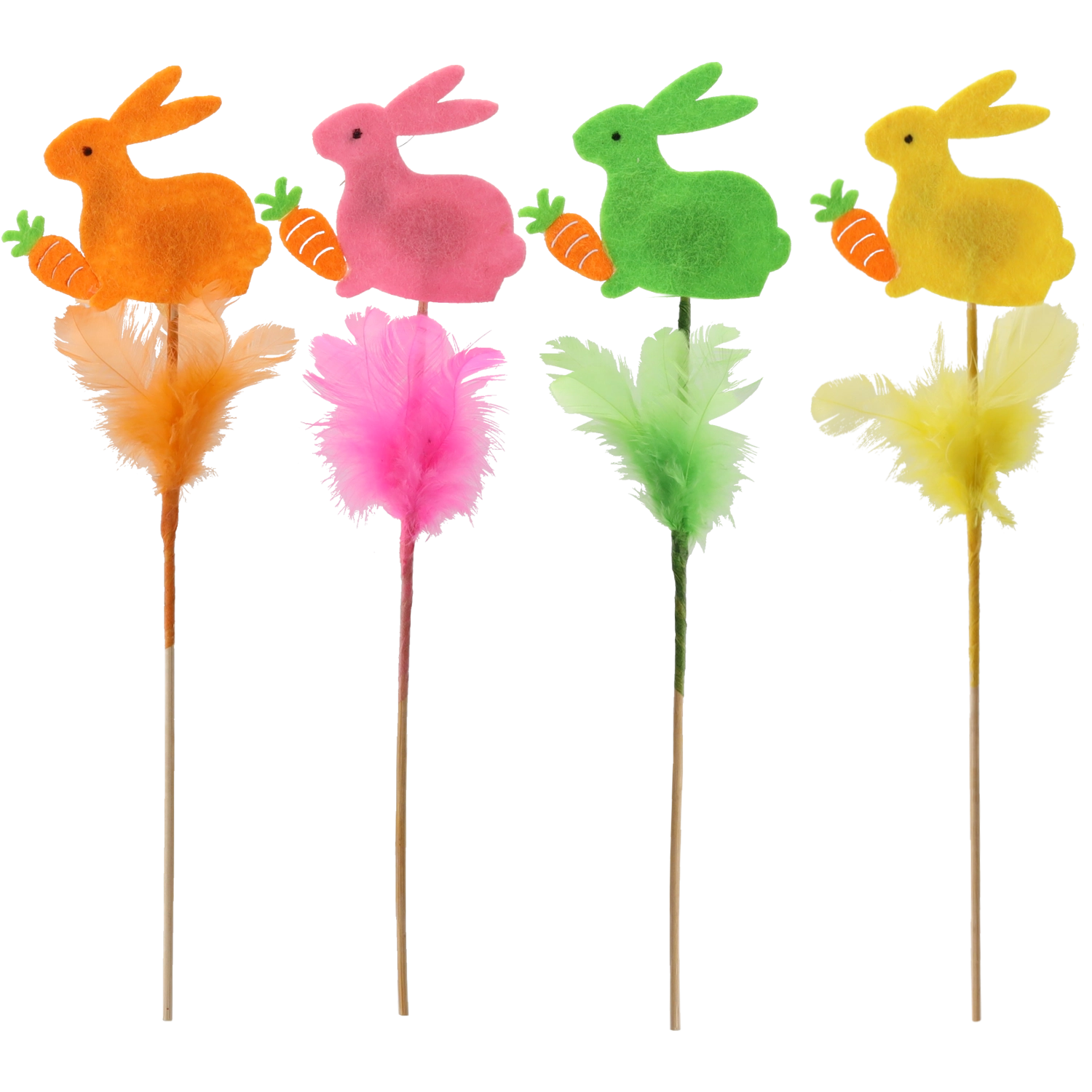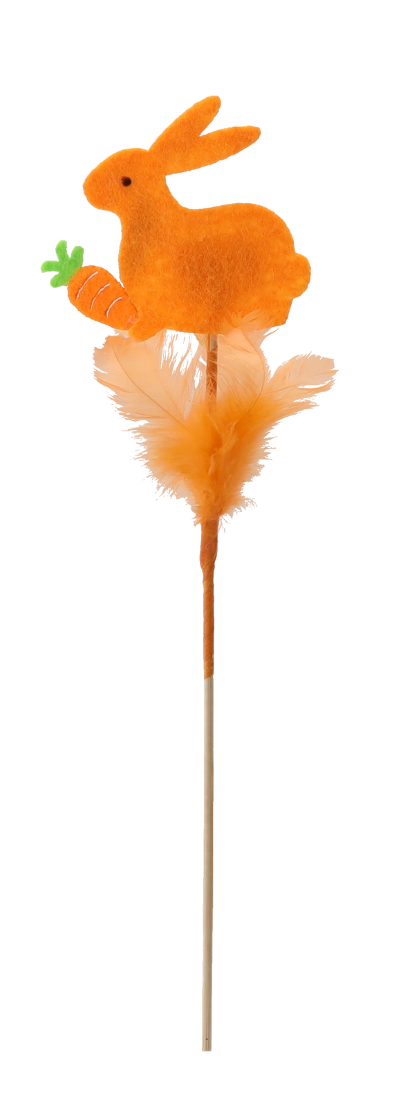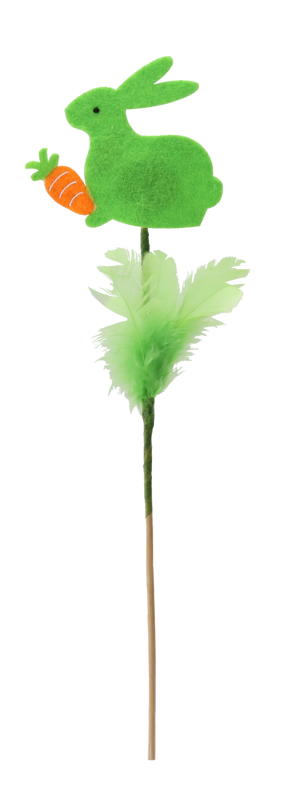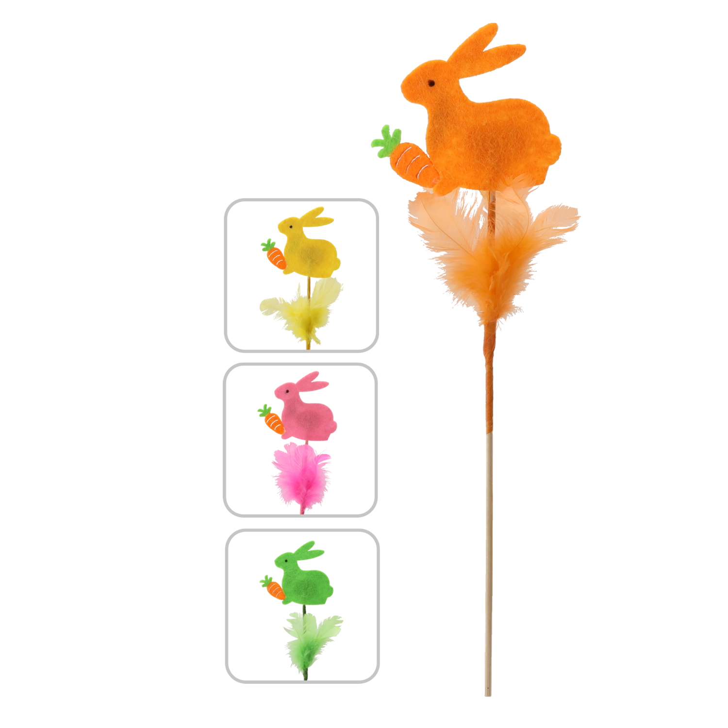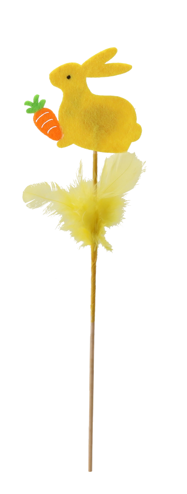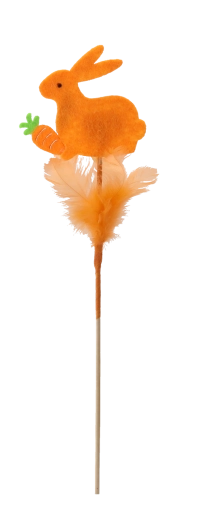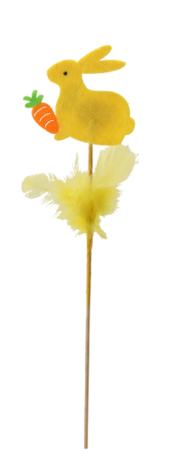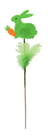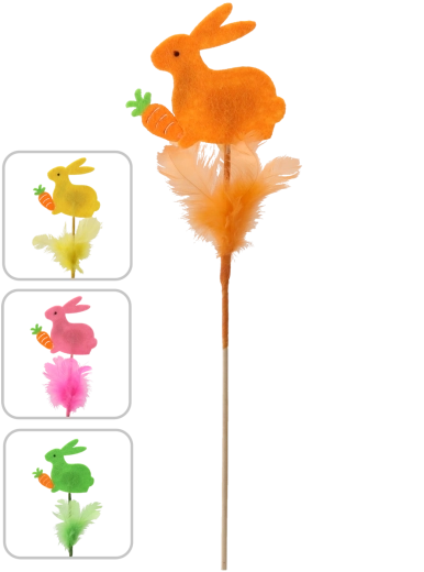 Aranyos húsvéti dísz – nyuszi pálcikán tollacskákkal, 29 cm magasságban, amely beragyog minden enteriőrt. A finom tollacskáknak és a pasztellszíneknek köszönhetően frissességet és örömöt hoz az otthonba. Könnyen elhelyezhető virágkompozíciókban, vázákban vagy húsvéti kosarakban, és kiváló többszöri felhasználásra több szezonon át.